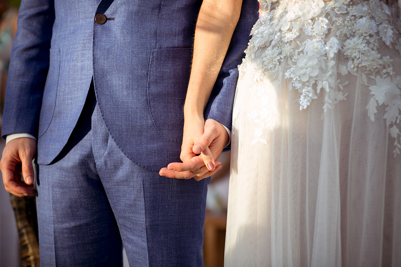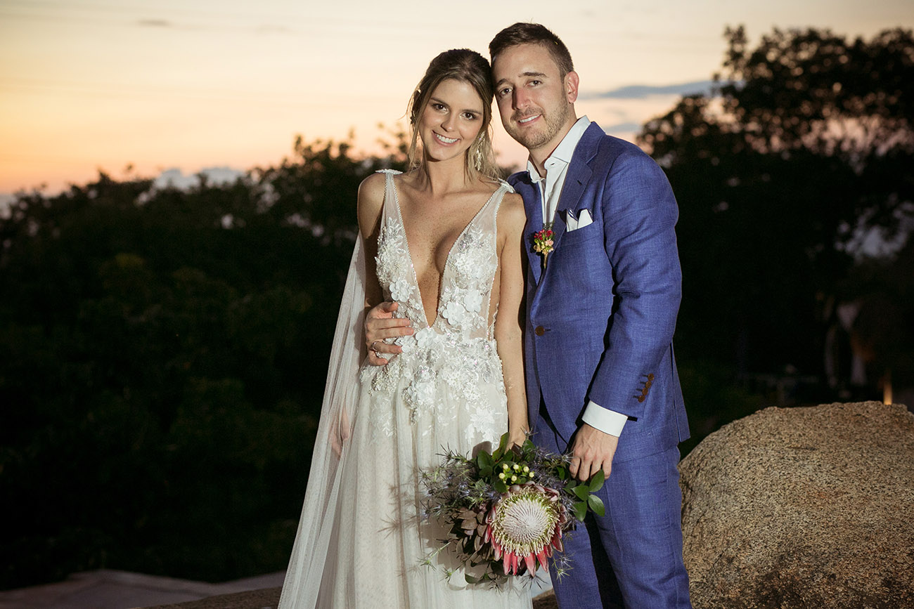 Sara nunca tuvo un tablero en Pinterest. Buscó referentes únicamente cuando Mateo le hizo la propuesta. La indicada para un lugar donde el viento y el clima pueden jugar a favor —o en contra— fue Luisa Nicholls. Un vestido ligero, fresco y lleno de detalles que, después de un proceso de diseño, cautivó la mirada de Sara. En la hora loca lo complementó con una corona que le combinó a sus aretas. A Mateo lo vistió Simón Martelo. Por eso, cada viaje a Bogotá fue una excusa para revisar avances de su traje en lino italiano azul.