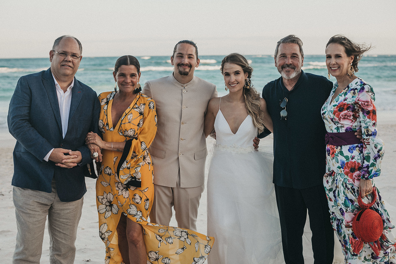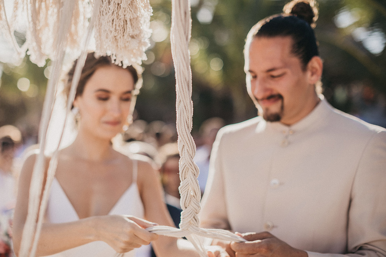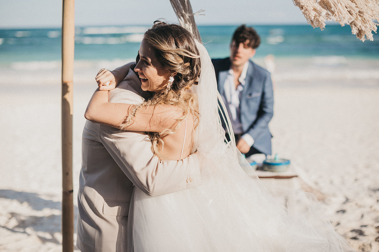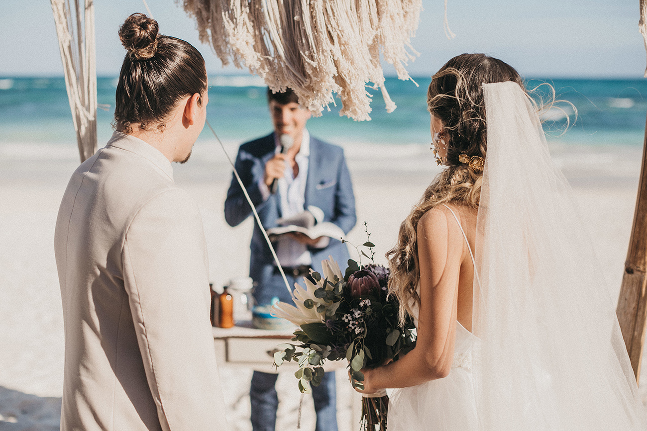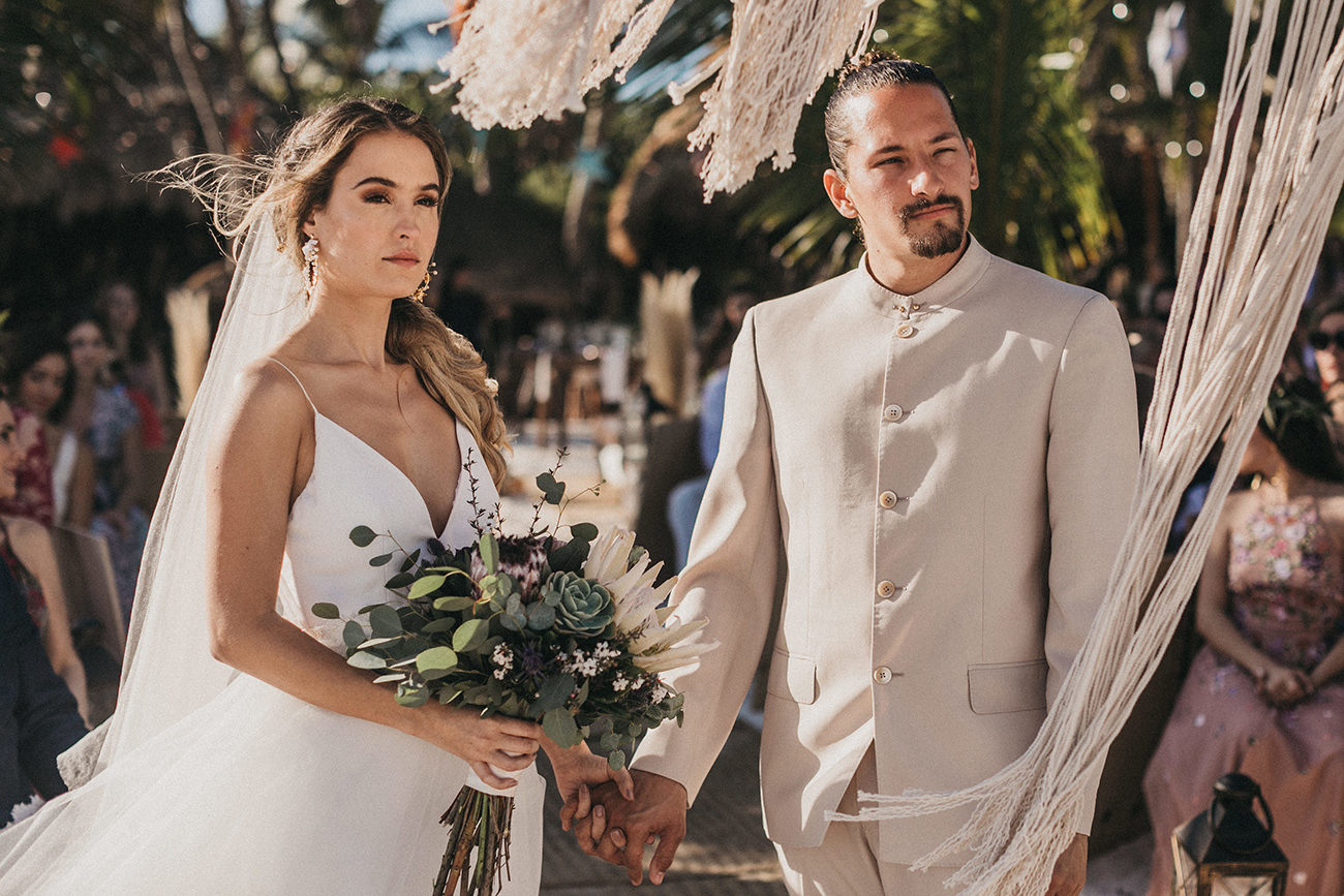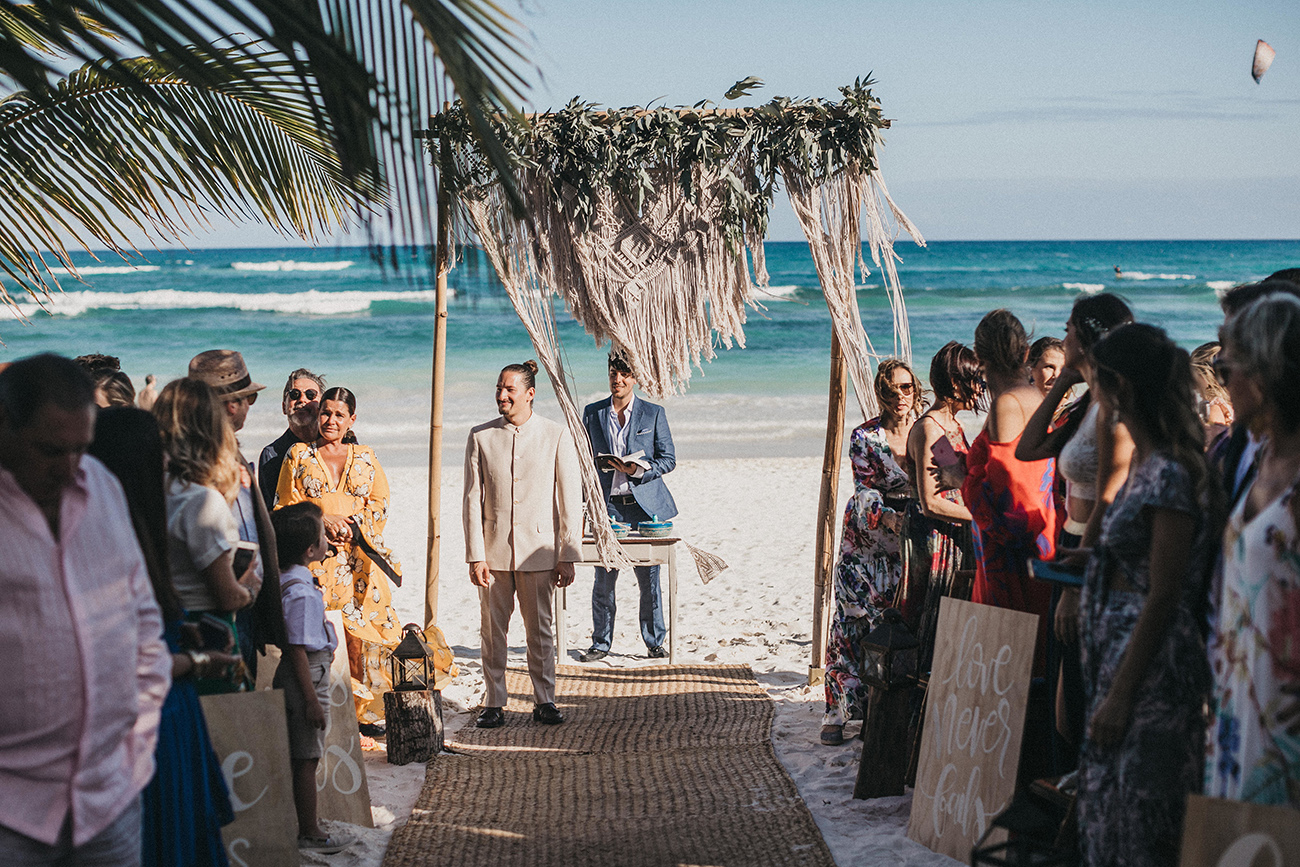 Un 2 de febrero, la playa, el cielo y el mar de Tulum estuvieron en sincronía con el amor de Mau y Sara. Al arco lo acompañaban un arreglo en macramé, hecho por Ancestral y varios pedazos de madera donde se leía aquel versículo de amor. Era el inicio de una ceremonia corta, trascendental, profunda. Era el inicio de otra vida y a la vez de esa misma que habían elegido hacía cinco años.