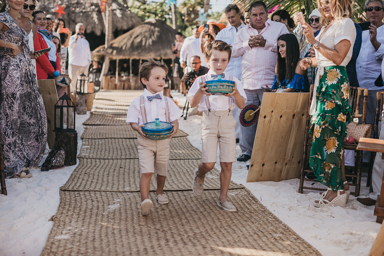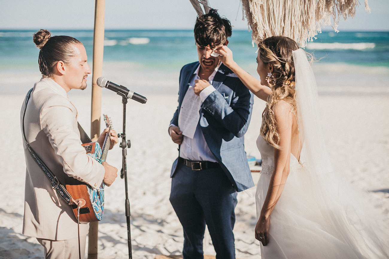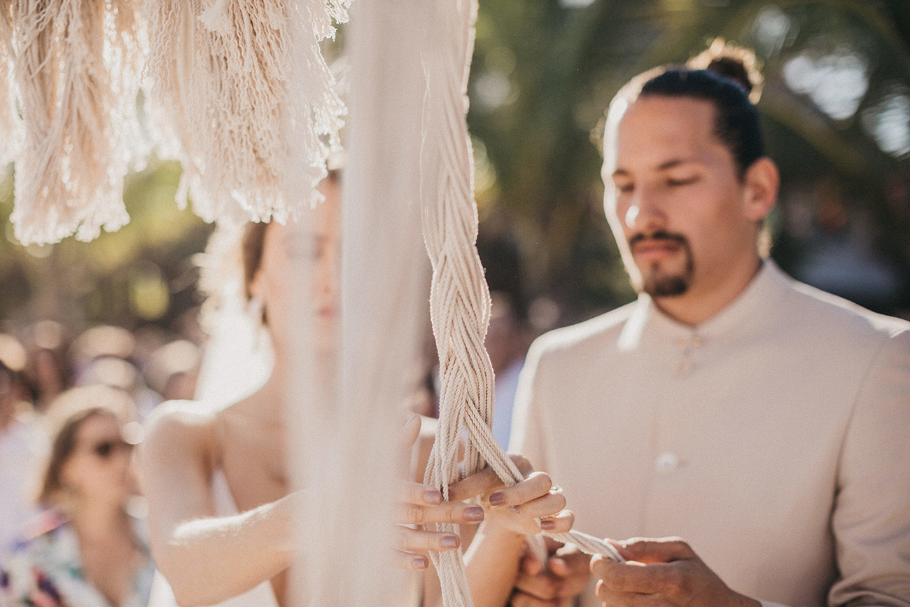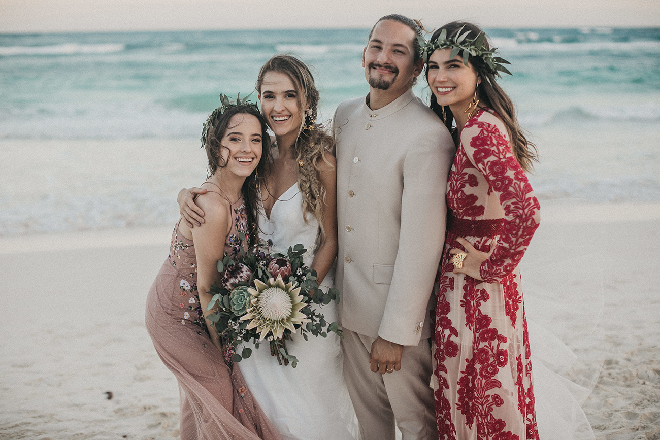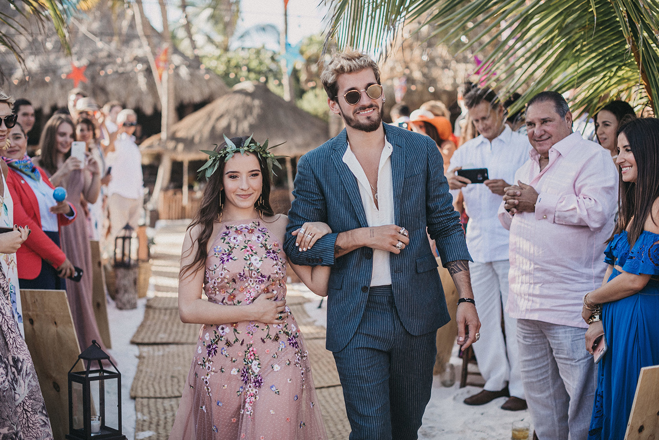 Un 2 de febrero, la playa, el cielo y el mar de Tulum estuvieron en sincronía con el amor de Mau y Sara. Al arco lo acompañaban un arreglo en macramé, hecho por Ancestral y varios pedazos de madera donde se leía aquel versículo de amor. Era el inicio de una ceremonia corta, trascendental, profunda. Era el inicio de otra vida y a la vez de esa misma que habían elegido hacía cinco años.