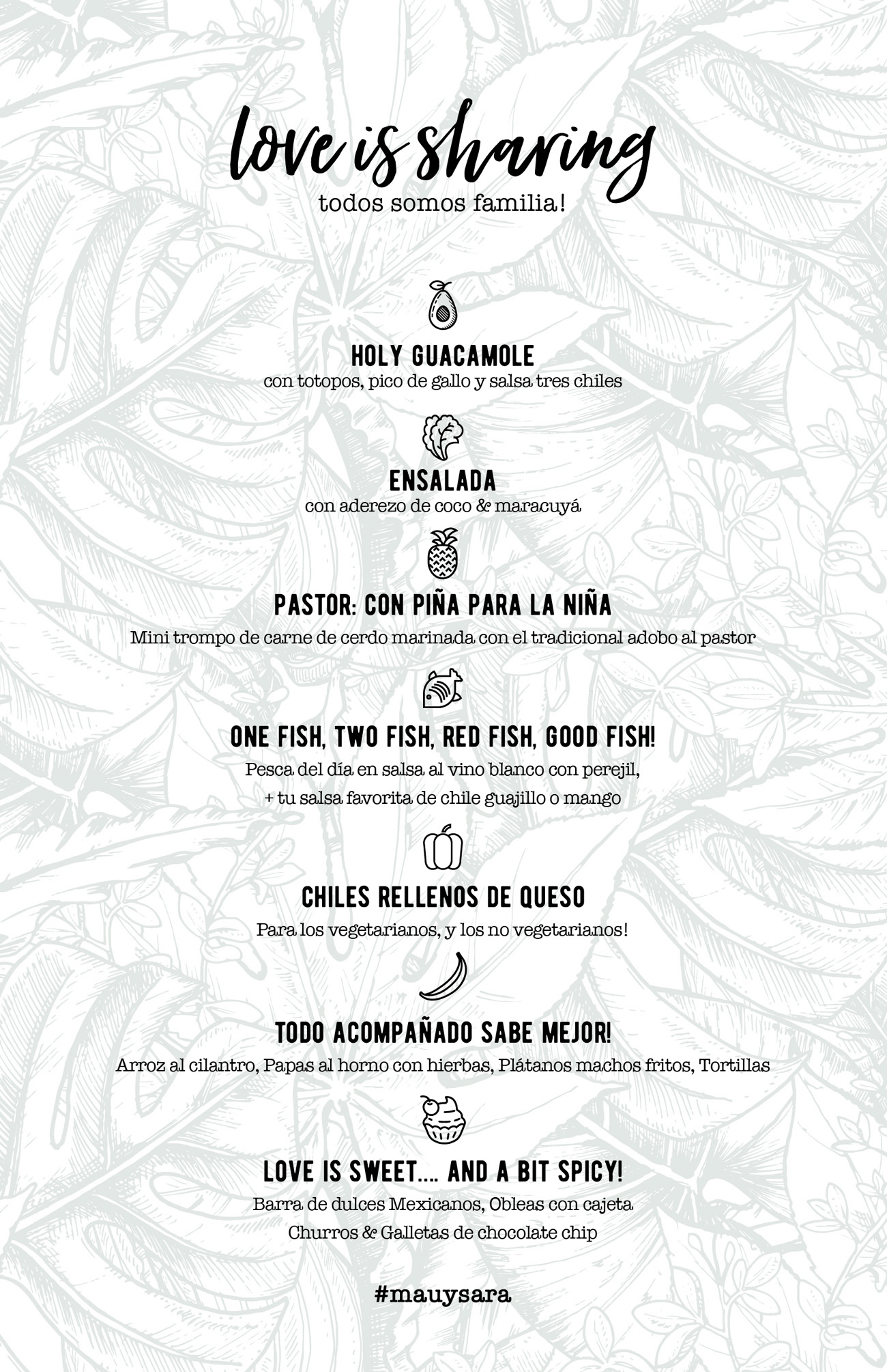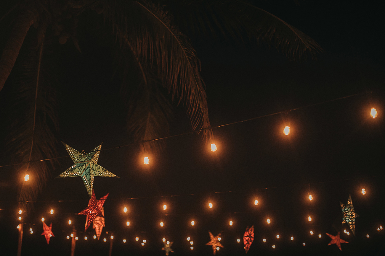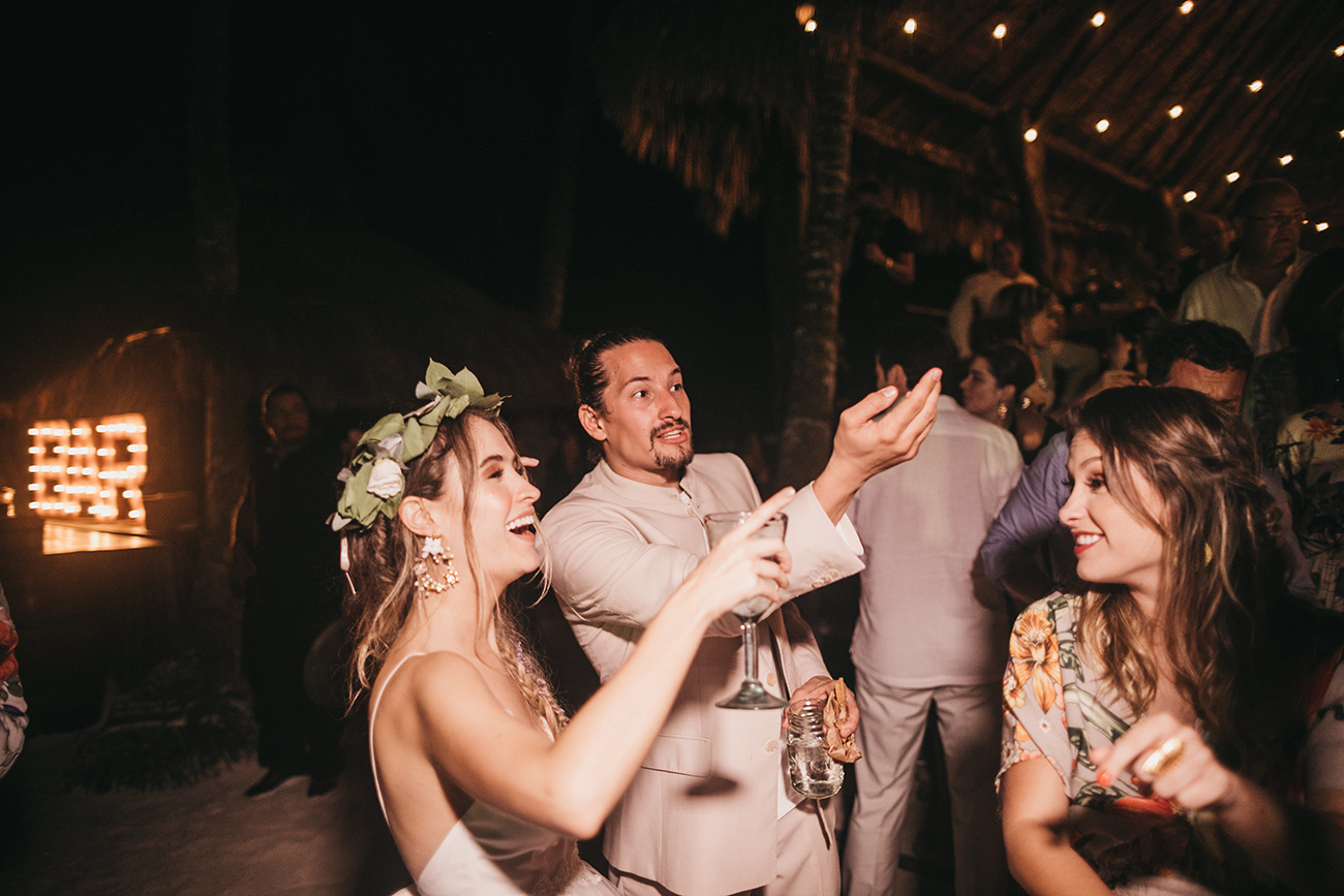 Un día antes de ese 2 de febrero, Sara y Mau decidieron que la pista de baile no estaría. Mejor, mucho mejor la arena. Mejor, mucho mejor todos los invitados descalzos. Mejor, mucho mejor sentir que estaban en el matrimonio de dos personas que evitan los formalismos y recurren a sus gustos, a lo que los hace sentir que están siendo ellos y no otros. Por eso, tampoco hubo bufete o plato servido sino una mesa grande a donde todos llegaban a reunirse como familia: tortillas, tacos, carne al pastor, todo muy mexicano. Mini postres, que incluyeron churros con arequipe y galletas (con vasitos de leche).