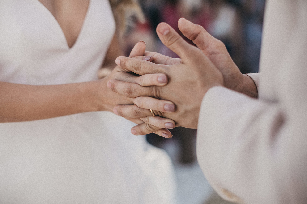 Una ceremonia cristiana, que se pareció más a una conversación. Porque para ellos, eso es ser cristianos: conversar con Dios. No había un formato, días antes entre los tres decidieron cómo sería, sobre qué hablarían; y eso fue lo que hicieron: conversaron sobre amor, sobre cómo es la vida cuando hay otro hombro al lado, sobre la fortuna de tenerse como cómplices. Se dijeron que se querían de varias formas, también simbólicamente: hicieron una trenza con la tela del macramé para representar que el lazo de ellos con Dios es irrompible, juntaron las arenas de dos botellitas pequeñas en una más grande para reconocer que sus esencias se mezclan, se unen. También, recibieron las arras —de la abuela de Sara— que significan abundancia y pareciese que el amor ha sabido interpretar esa definición.