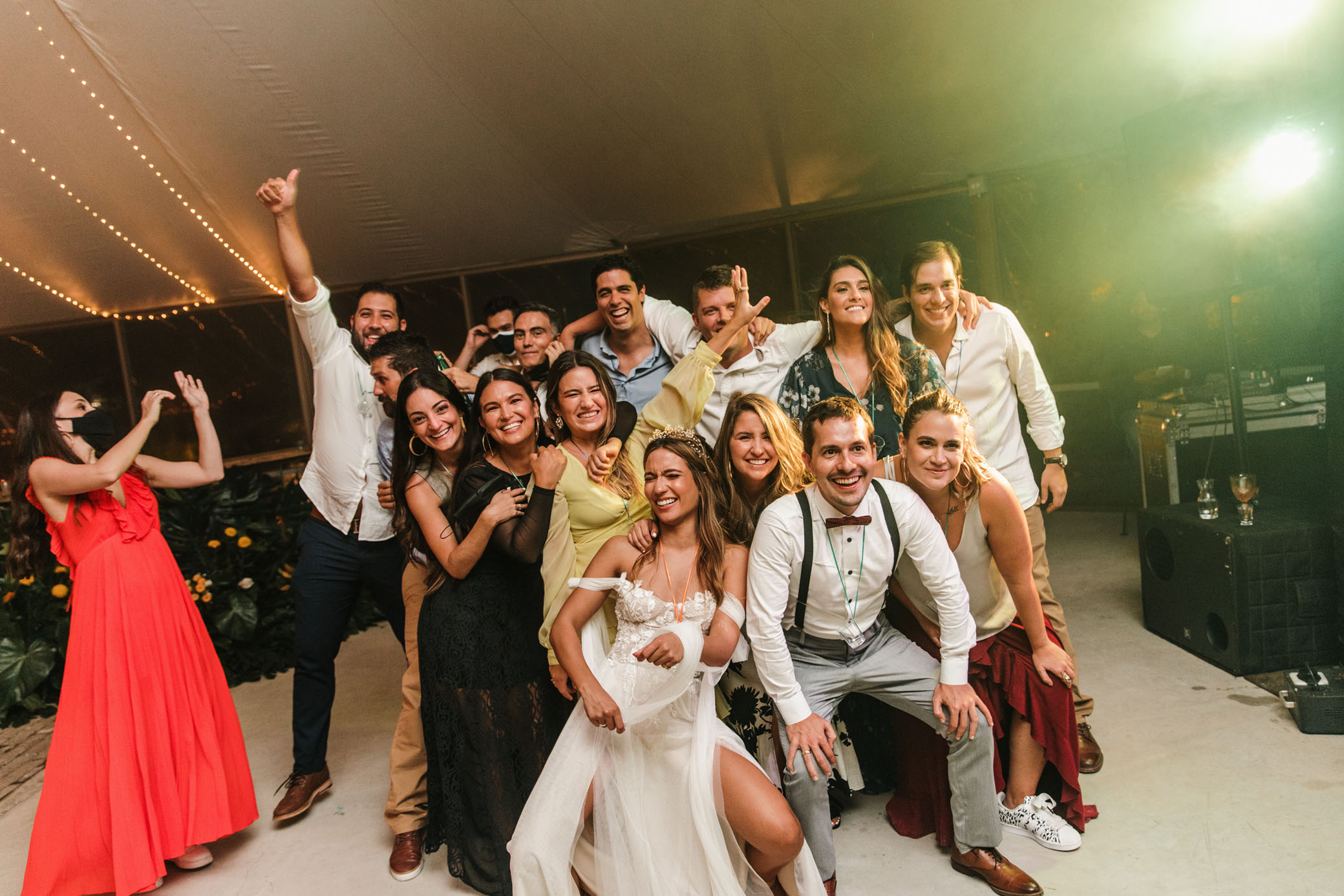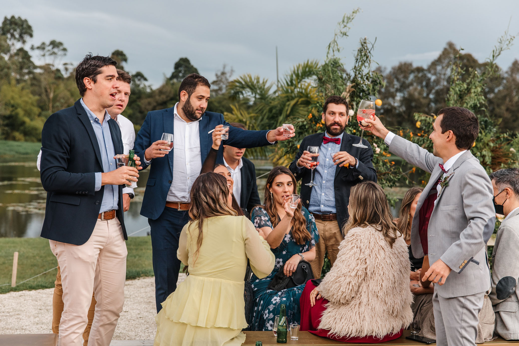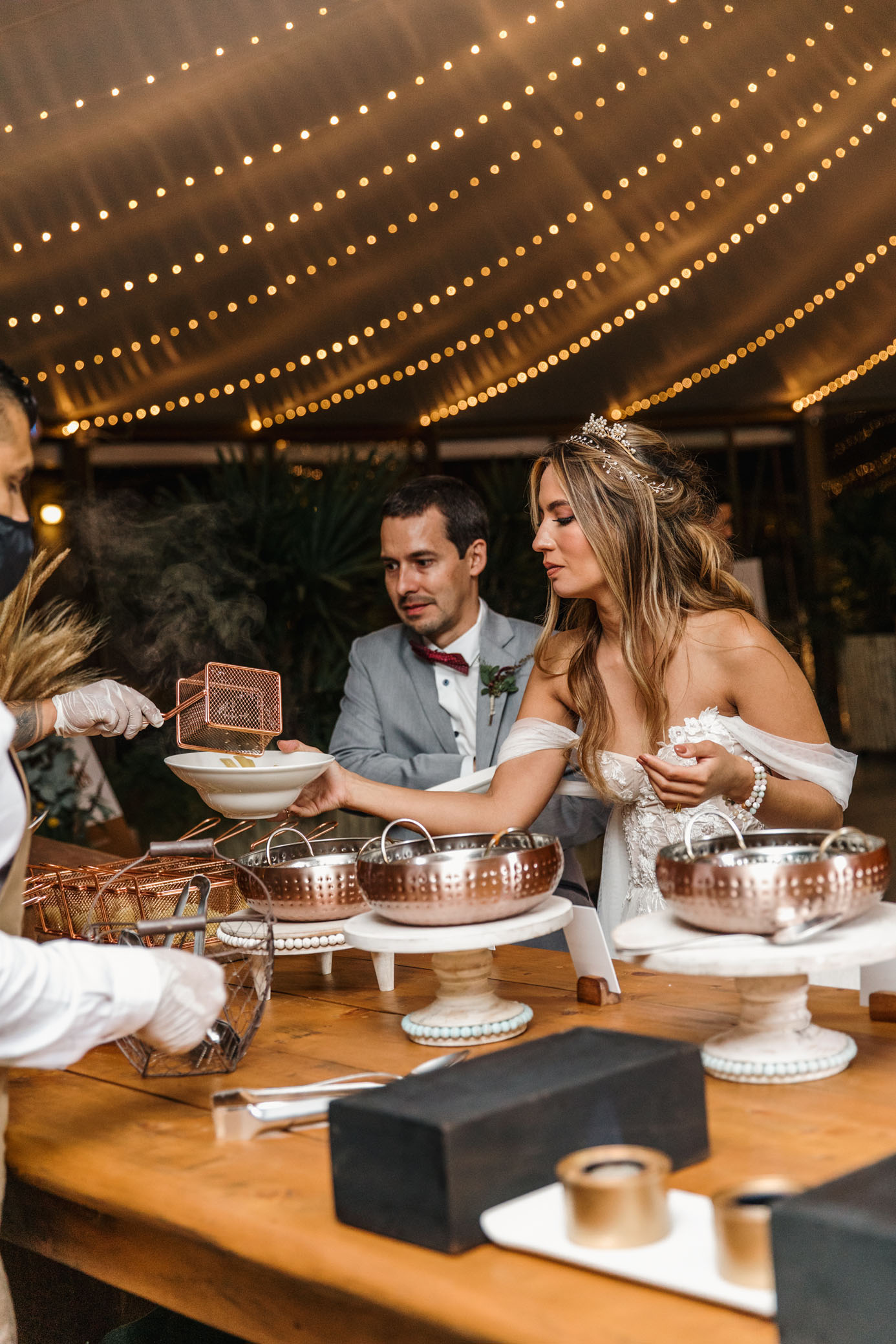 Llegó la hora de bailar y comenzar la fiesta. Sara y Santiago tenían muy claro que querían abrir la pista de baile con una canción de reggaetón, no querían nada lento ni romántico. Tampoco bailar en pareja. Querían algo muy movido y alegre, espontáneo, que motivara a los invitados a unirse a la pista y empezar la rumba. La cena incluía dos tipos de pastas con tres salsas a elección y una opción vegetariana. Una mesa de postres a cargo del papá de María Susana, una de las mejores amigas de Sara, y gelato de Amoracuyá. Todo muy italiano, en honor al país favorito de los novios. Por medidas de bioseguridad, la fiesta solo podía ser hasta las 12 de la noche. Sara, rendida, se durmió a las 10 no sin antes cumplir su último deseo: pedir pizzas para todos los invitados que ya estaban con varios tragos encima y cansados de tanto bailar.