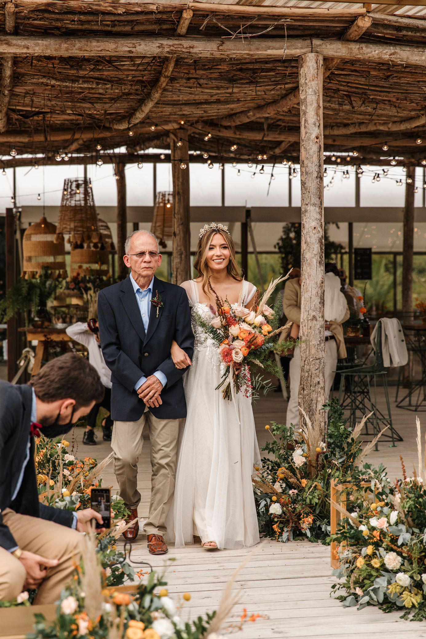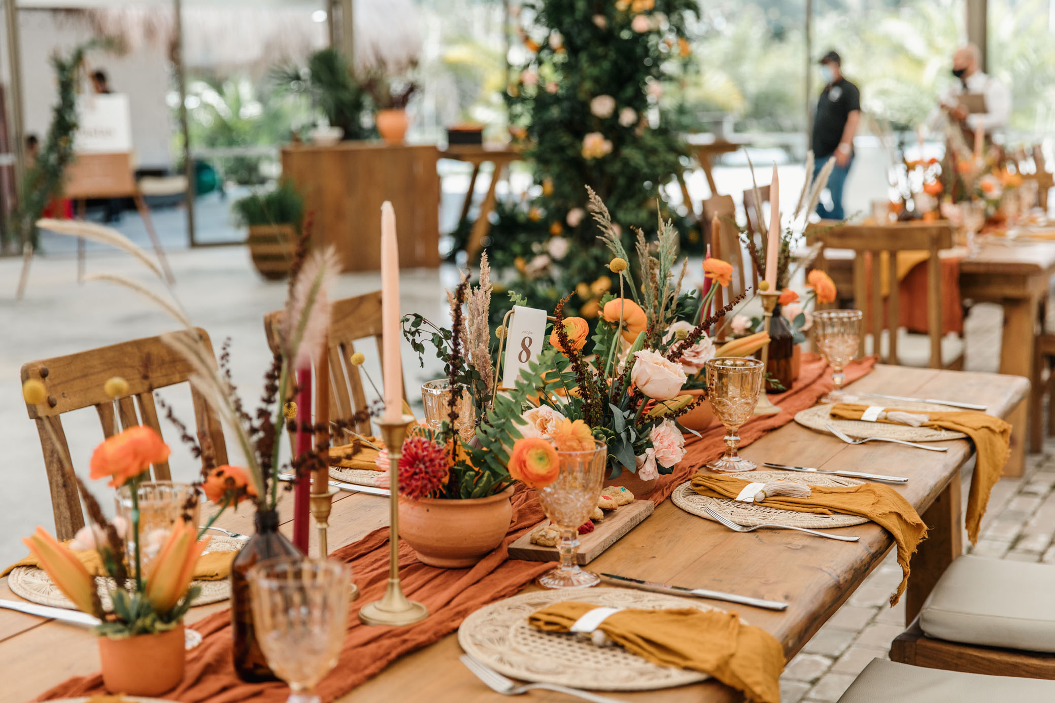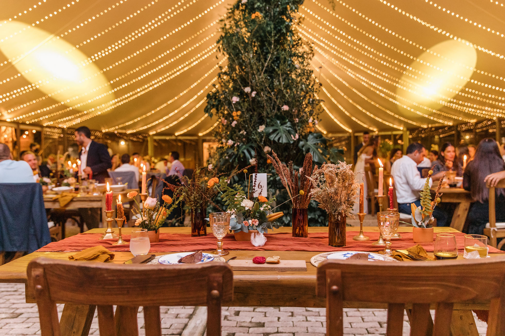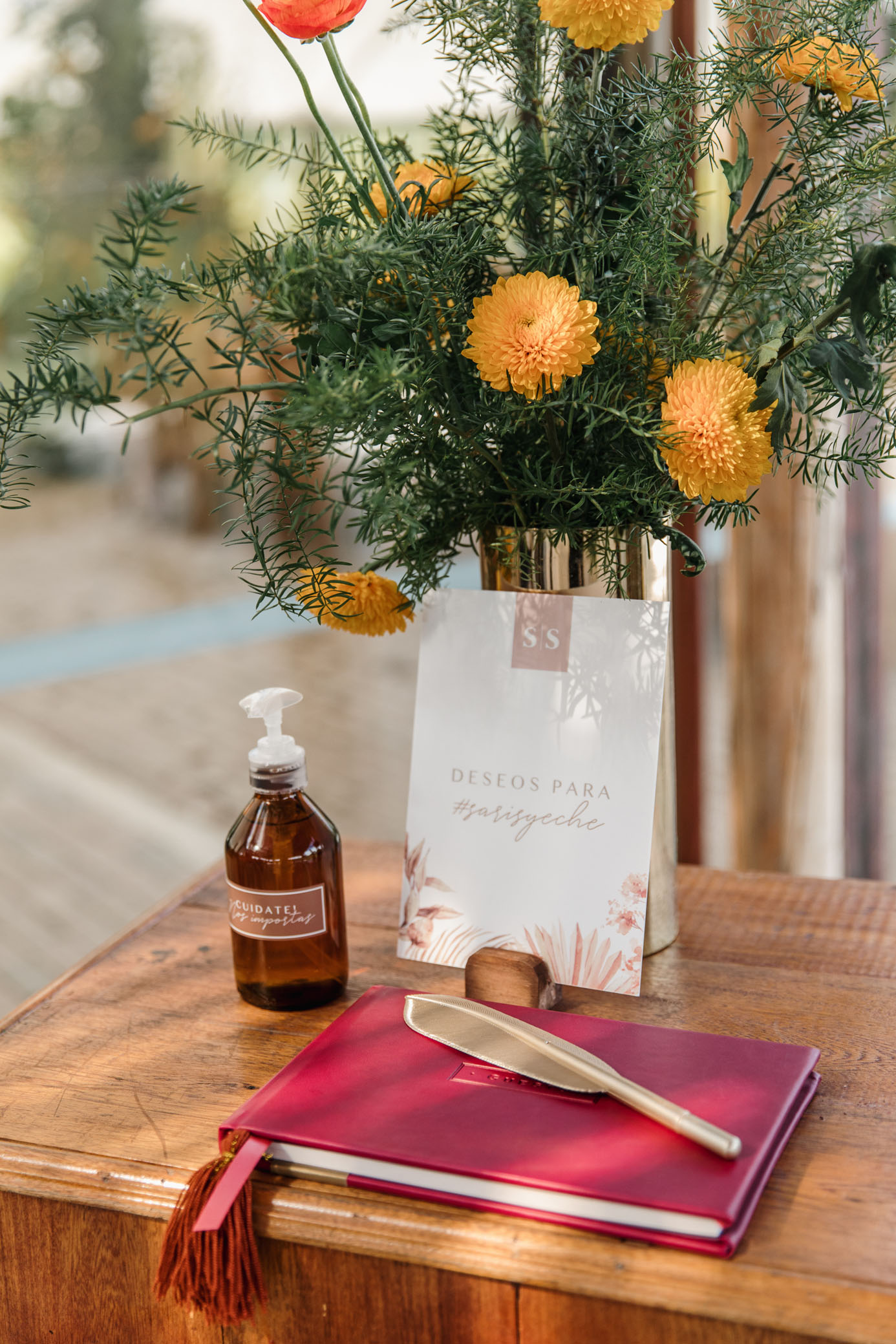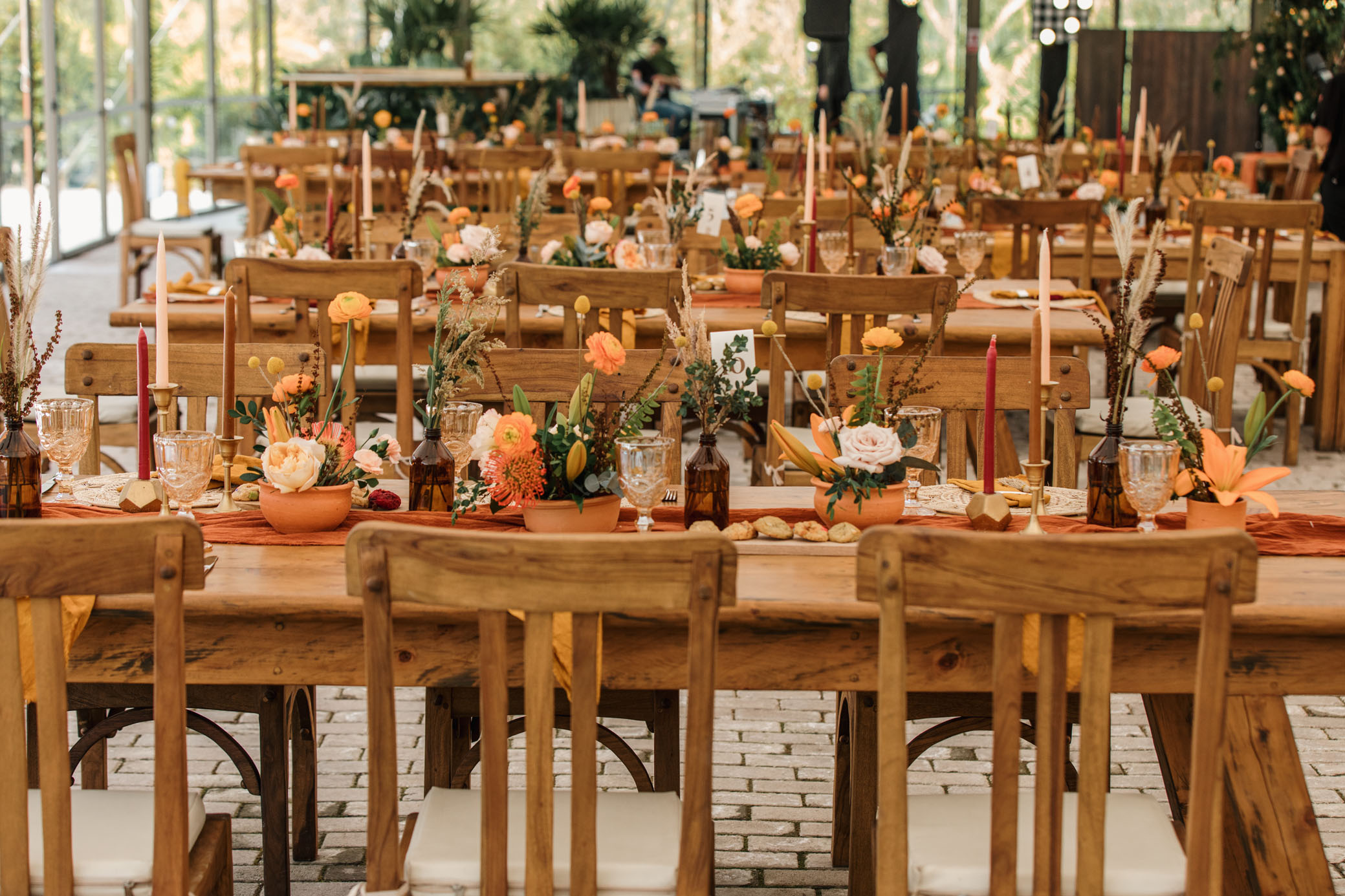 Durante este tiempo, la ansiedad se apoderó de nuevo de Sara, quien no veía la hora de llegar al altar y bailar toda la noche en la fiesta de sus sueños. Para entretenerse y hacer más llevadera la espera, tiñó todas las servilletas que usarían en la comida la noche de la fiesta. Caro Chica, amiga y cuñada de su esposo, fue su cómplice y apoyo en el diseño de la decoración, que incluyó rosas rosadas y ranúnculos anaranjados, faroles de mimbre, recipientes en barro, candelabros dorados, botellas de vidrio, velas de color rojo y caminos de mesa terracota sobre las mesas. Un ambiente otoñal que asemejaba la escena del día de la pedida de mano, con muchas hojas, mucho verde. Lo cálido y lo sencillo como fórmula ganadora. Por supuesto, también las servilletas color mostaza teñidas meses antes a manera de terapia y meditación mientras llegaba el día. No fue tampoco el 21 de marzo. Por diferentes motivos la boda se aplazó para el 6 de junio del 2021. Y ese día por fin llegó.