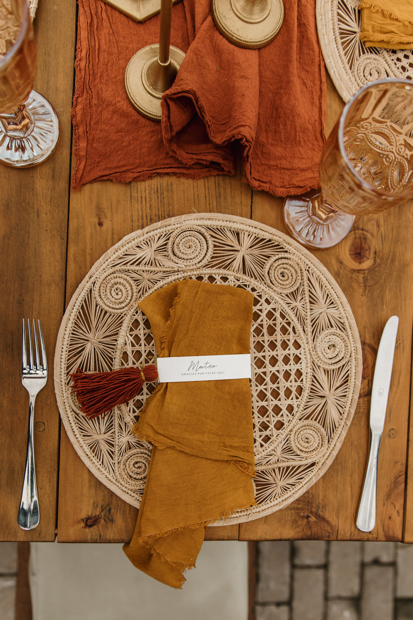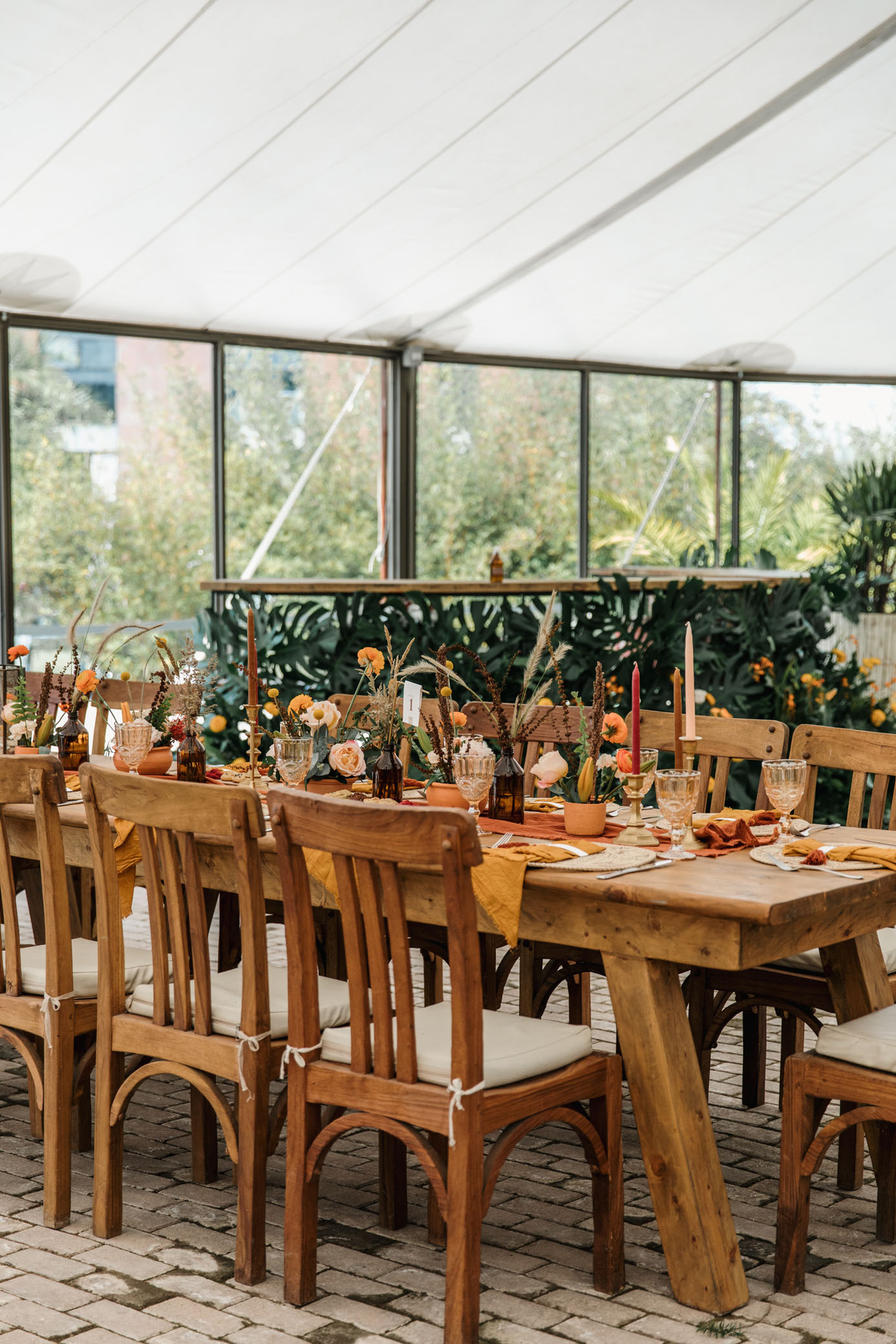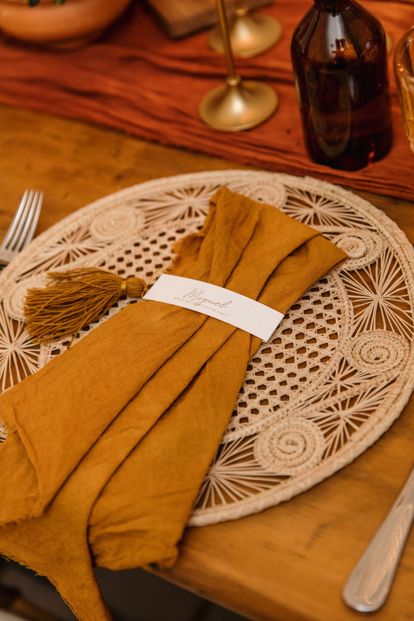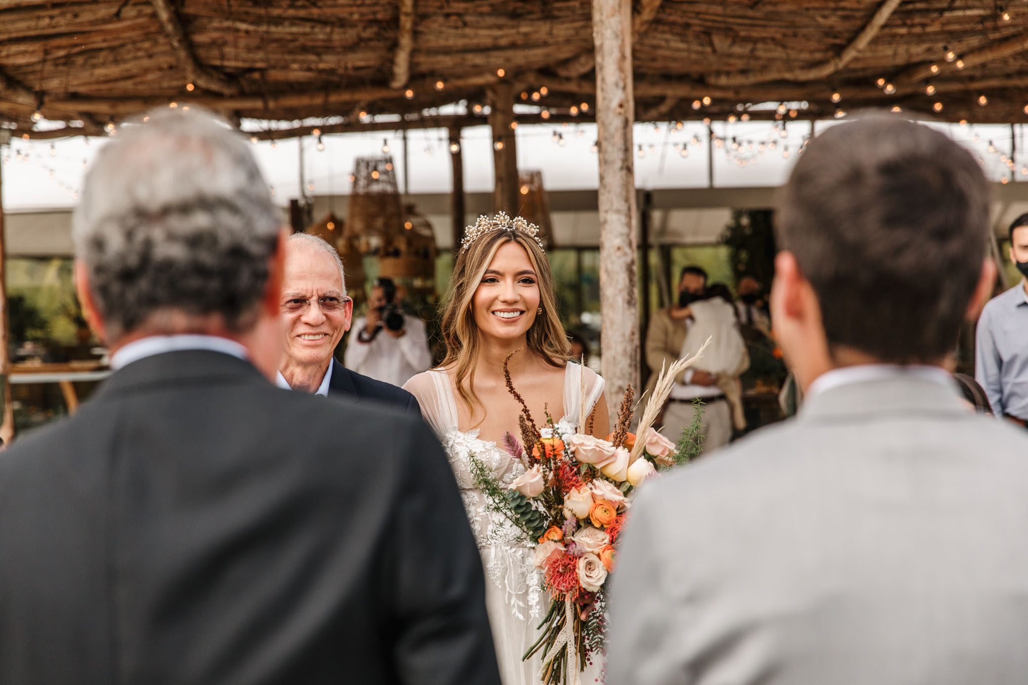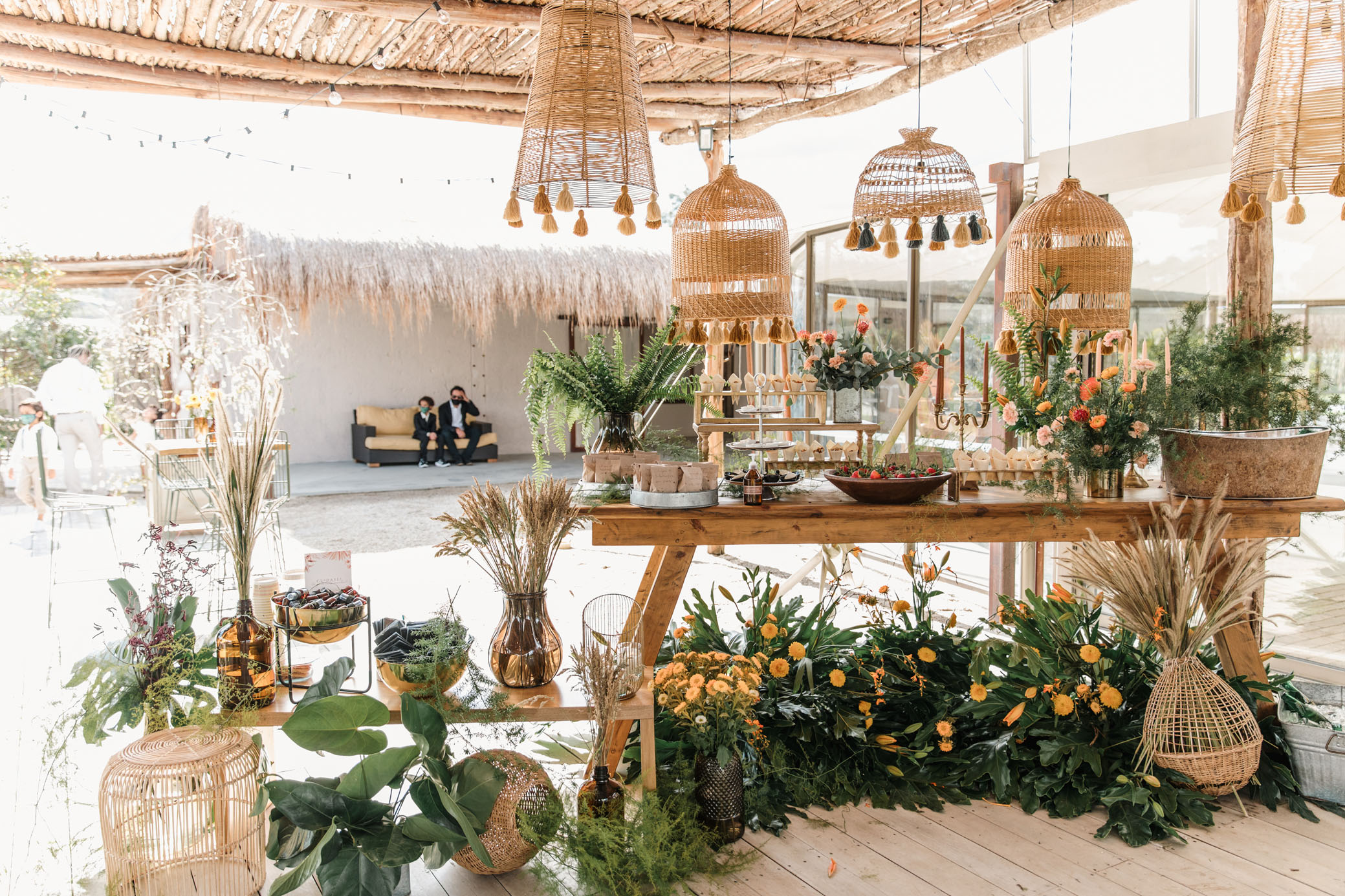 Durante este tiempo, la ansiedad se apoderó de nuevo de Sara, quien no veía la hora de llegar al altar y bailar toda la noche en la fiesta de sus sueños. Para entretenerse y hacer más llevadera la espera, tiñó todas las servilletas que usarían en la comida la noche de la fiesta. Caro Chica, amiga y cuñada de su esposo, fue su cómplice y apoyo en el diseño de la decoración, que incluyó rosas rosadas y ranúnculos anaranjados, faroles de mimbre, recipientes en barro, candelabros dorados, botellas de vidrio, velas de color rojo y caminos de mesa terracota sobre las mesas. Un ambiente otoñal que asemejaba la escena del día de la pedida de mano, con muchas hojas, mucho verde. Lo cálido y lo sencillo como fórmula ganadora. Por supuesto, también las servilletas color mostaza teñidas meses antes a manera de terapia y meditación mientras llegaba el día. No fue tampoco el 21 de marzo. Por diferentes motivos la boda se aplazó para el 6 de junio del 2021. Y ese día por fin llegó.