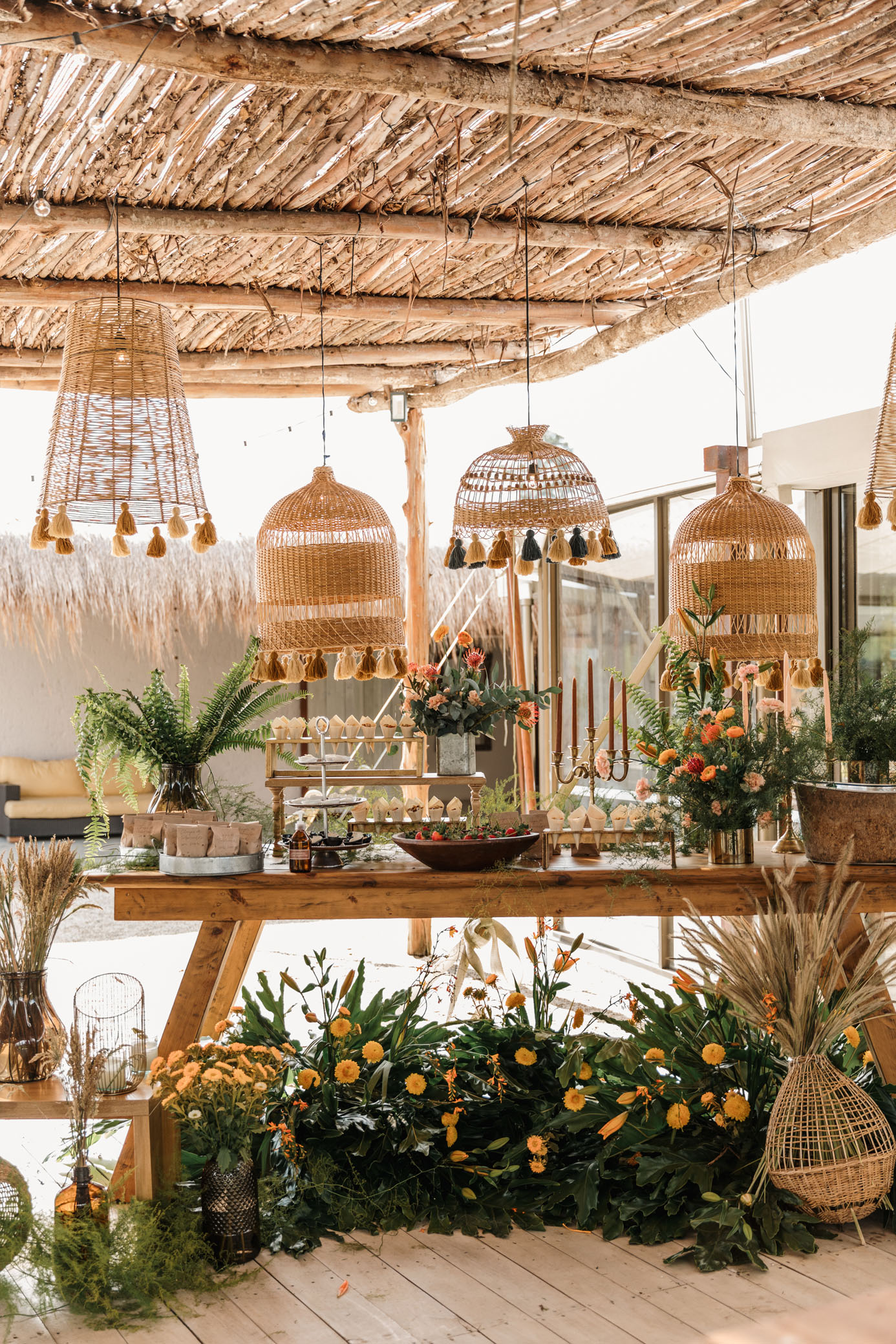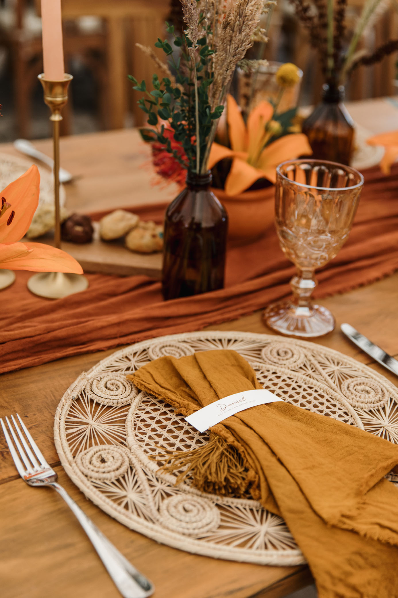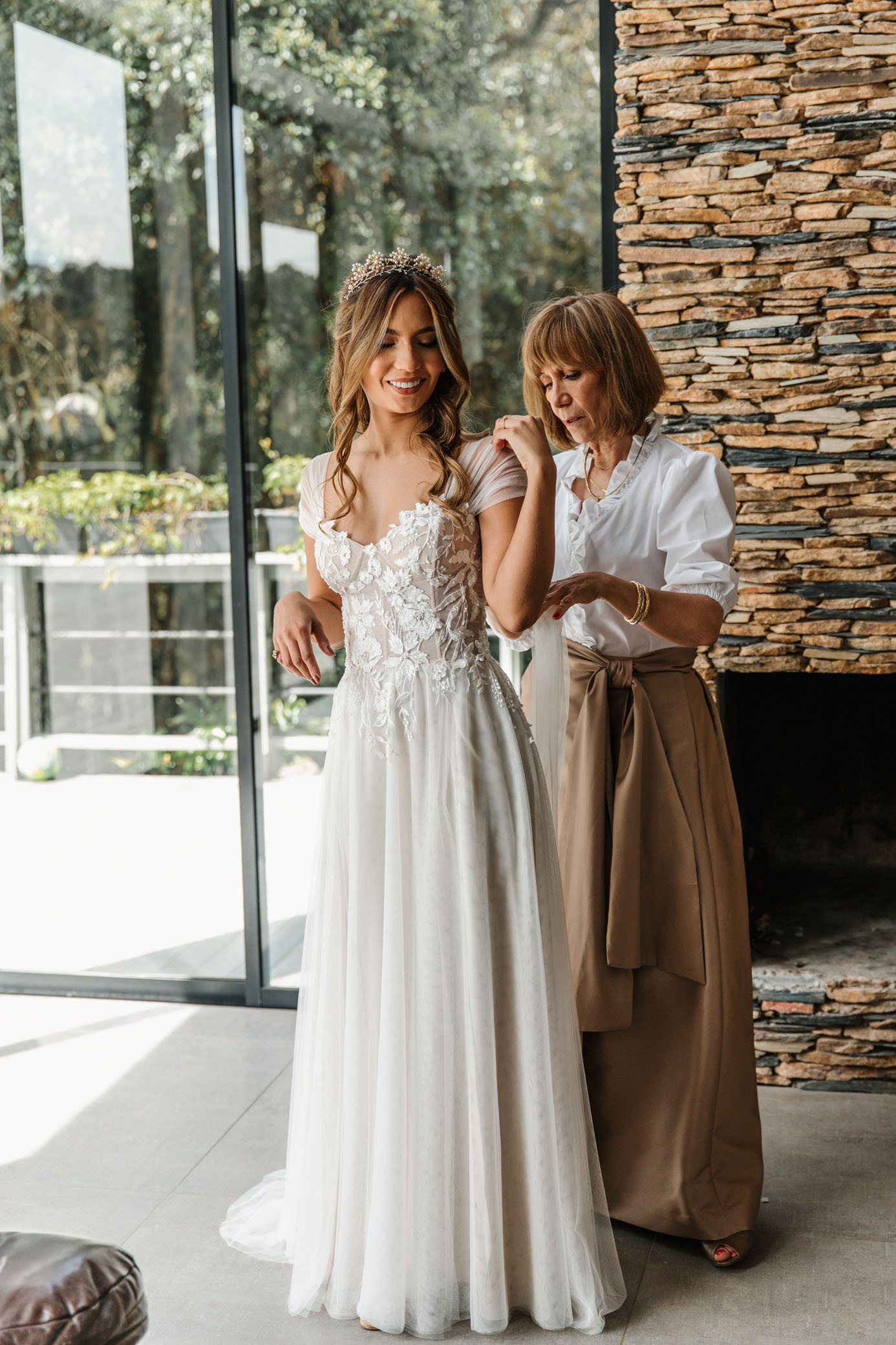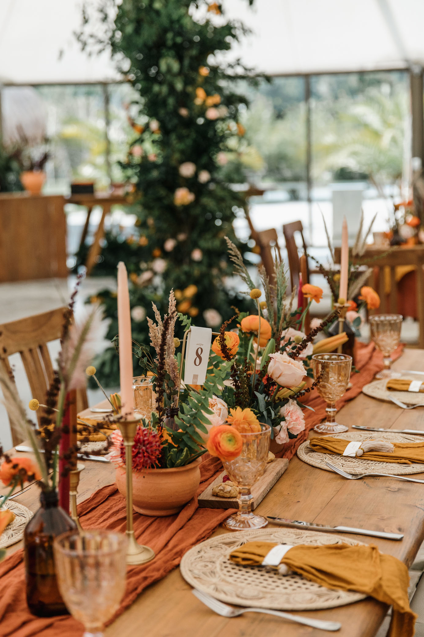 Durante este tiempo, la ansiedad se apoderó de nuevo de Sara, quien no veía la hora de llegar al altar y bailar toda la noche en la fiesta de sus sueños. Para entretenerse y hacer más llevadera la espera, tiñó todas las servilletas que usarían en la comida la noche de la fiesta. Caro Chica, amiga y cuñada de su esposo, fue su cómplice y apoyo en el diseño de la decoración, que incluyó rosas rosadas y ranúnculos anaranjados, faroles de mimbre, recipientes en barro, candelabros dorados, botellas de vidrio, velas de color rojo y caminos de mesa terracota sobre las mesas. Un ambiente otoñal que asemejaba la escena del día de la pedida de mano, con muchas hojas, mucho verde. Lo cálido y lo sencillo como fórmula ganadora. Por supuesto, también las servilletas color mostaza teñidas meses antes a manera de terapia y meditación mientras llegaba el día. No fue tampoco el 21 de marzo. Por diferentes motivos la boda se aplazó para el 6 de junio del 2021. Y ese día por fin llegó.