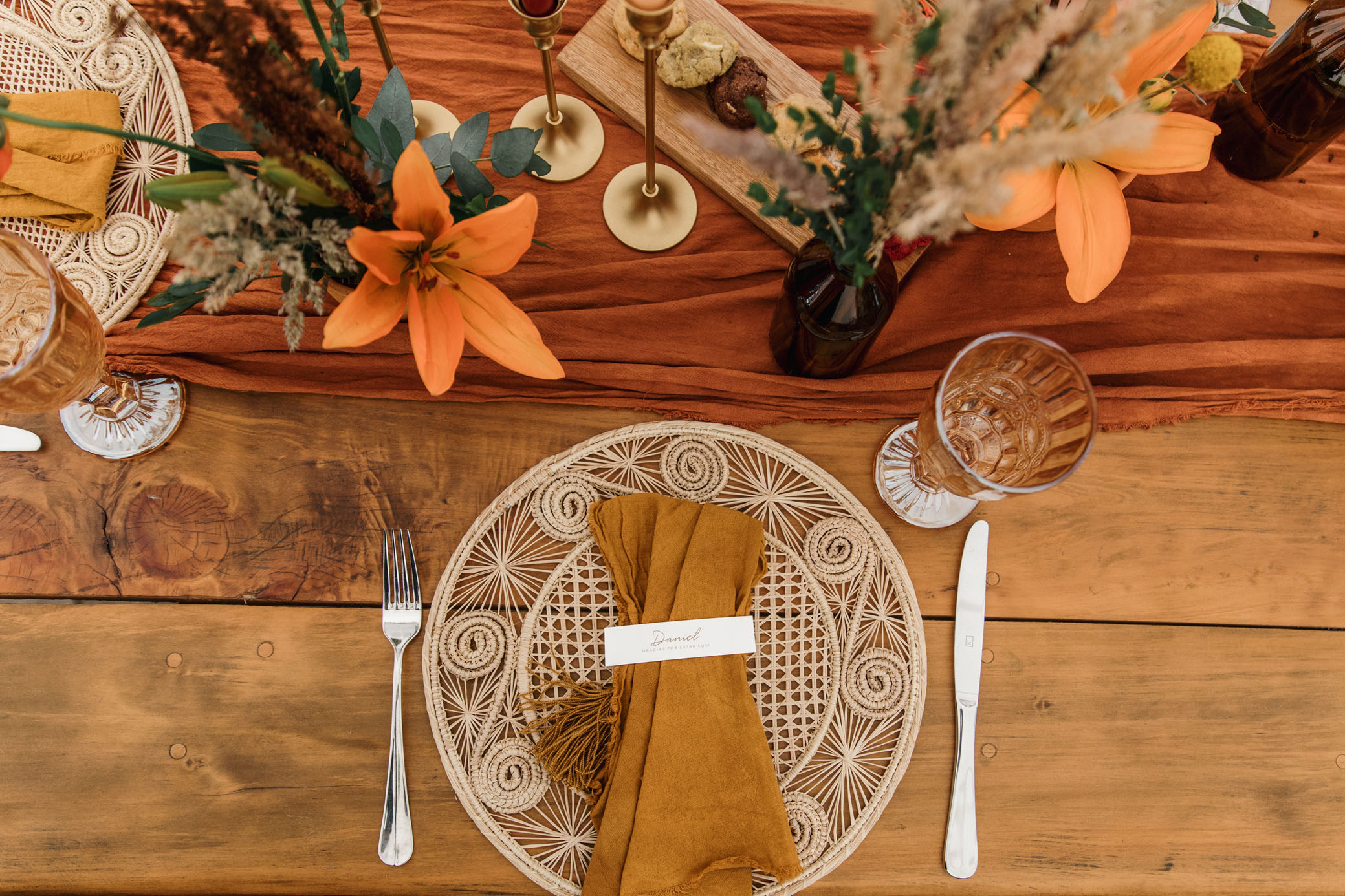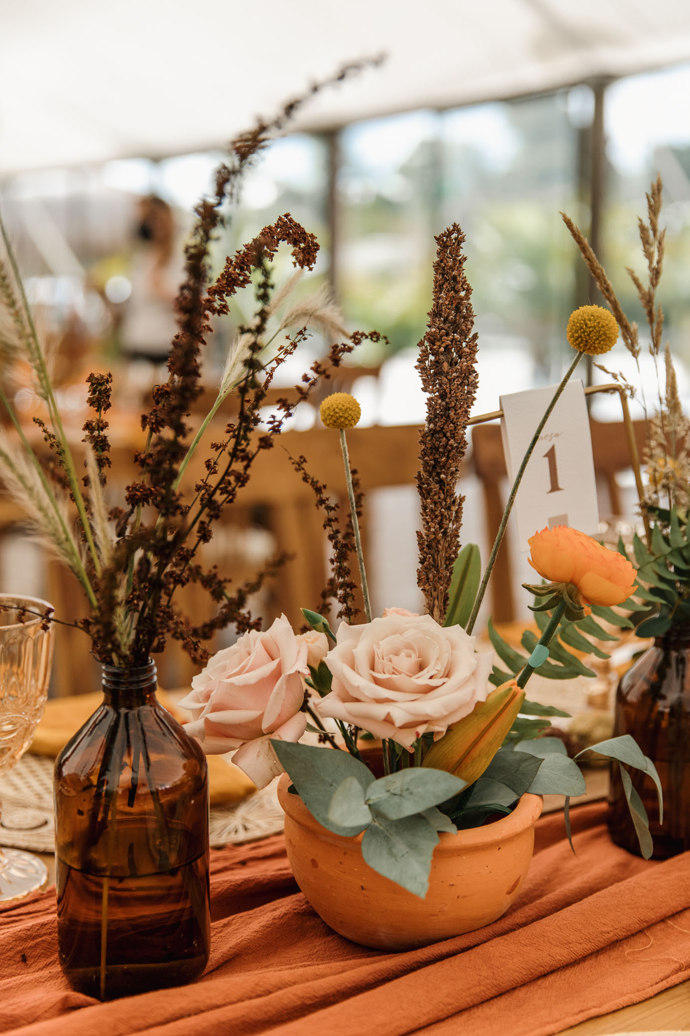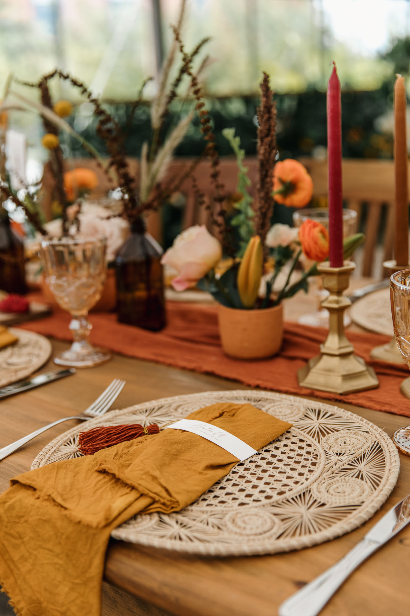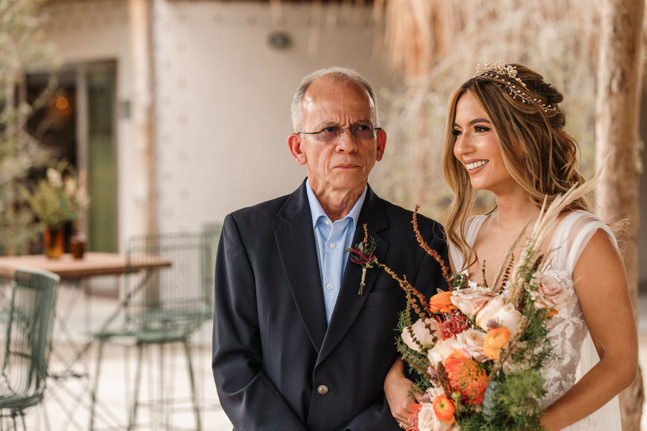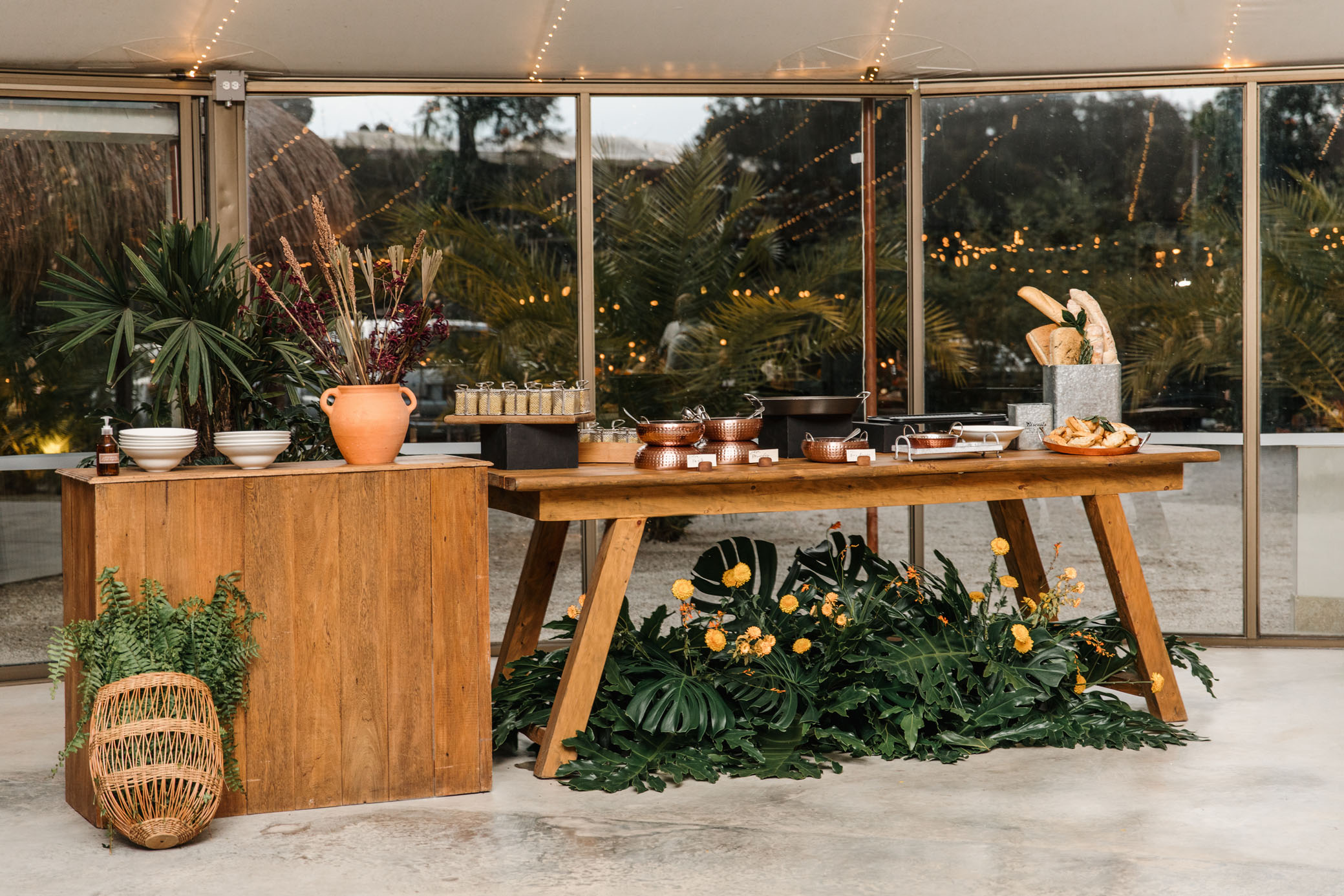 Durante este tiempo, la ansiedad se apoderó de nuevo de Sara, quien no veía la hora de llegar al altar y bailar toda la noche en la fiesta de sus sueños. Para entretenerse y hacer más llevadera la espera, tiñó todas las servilletas que usarían en la comida la noche de la fiesta. Caro Chica, amiga y cuñada de su esposo, fue su cómplice y apoyo en el diseño de la decoración, que incluyó rosas rosadas y ranúnculos anaranjados, faroles de mimbre, recipientes en barro, candelabros dorados, botellas de vidrio, velas de color rojo y caminos de mesa terracota sobre las mesas. Un ambiente otoñal que asemejaba la escena del día de la pedida de mano, con muchas hojas, mucho verde. Lo cálido y lo sencillo como fórmula ganadora. Por supuesto, también las servilletas color mostaza teñidas meses antes a manera de terapia y meditación mientras llegaba el día. No fue tampoco el 21 de marzo. Por diferentes motivos la boda se aplazó para el 6 de junio del 2021. Y ese día por fin llegó.