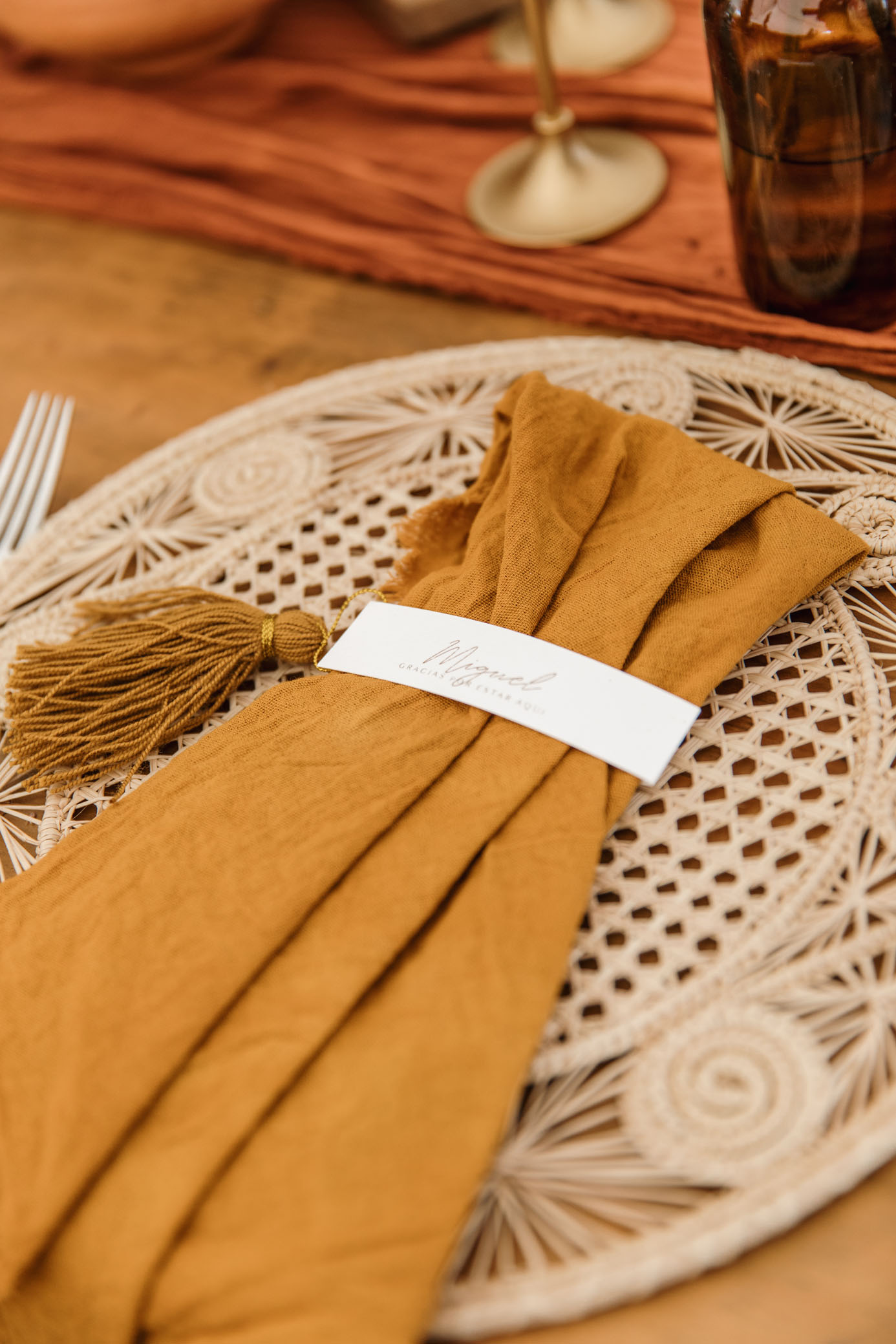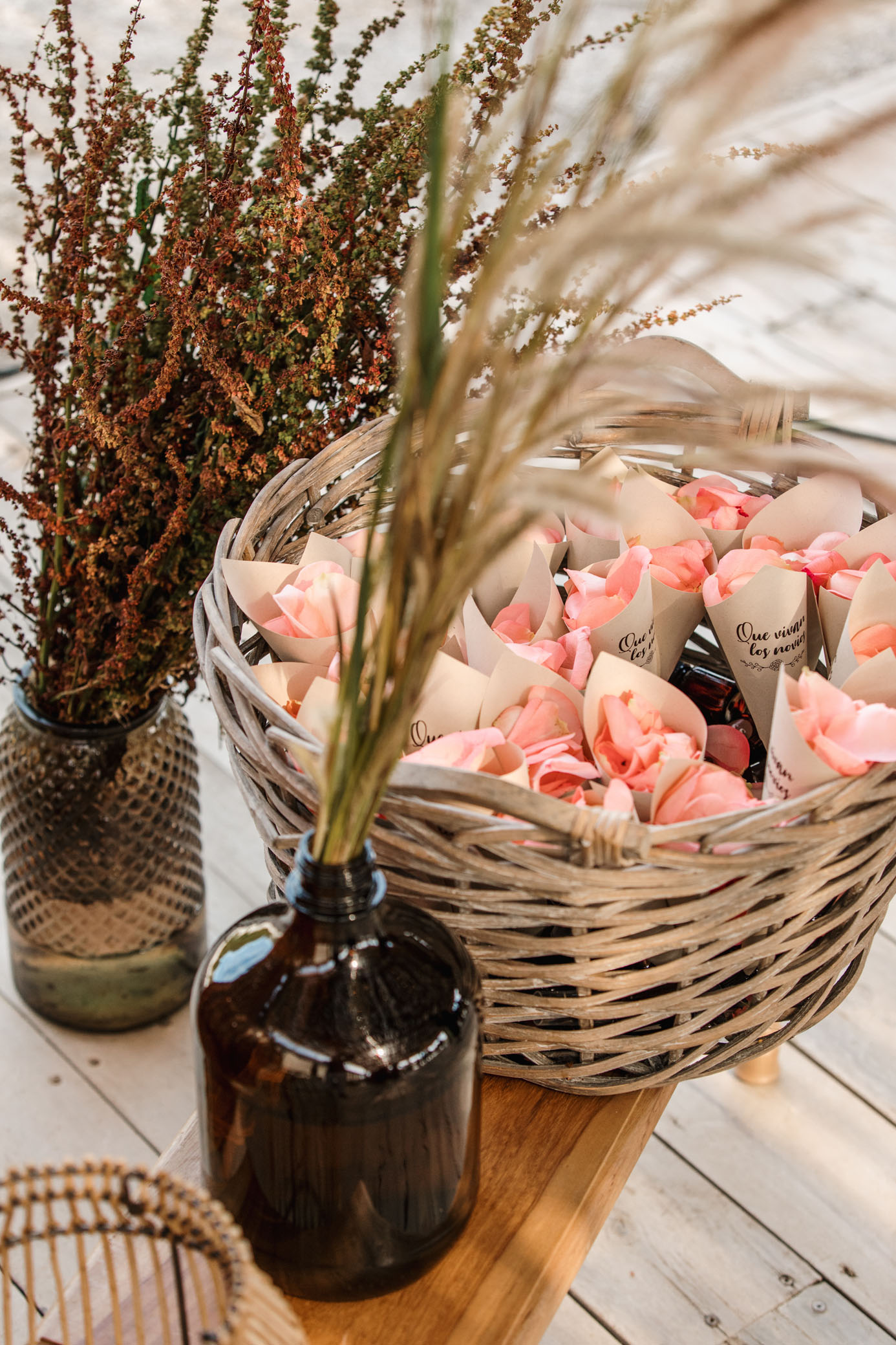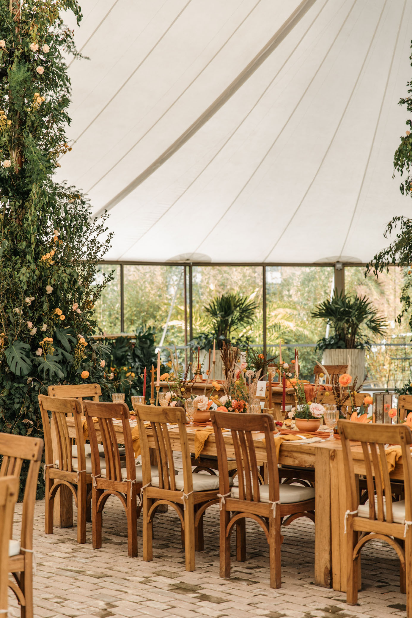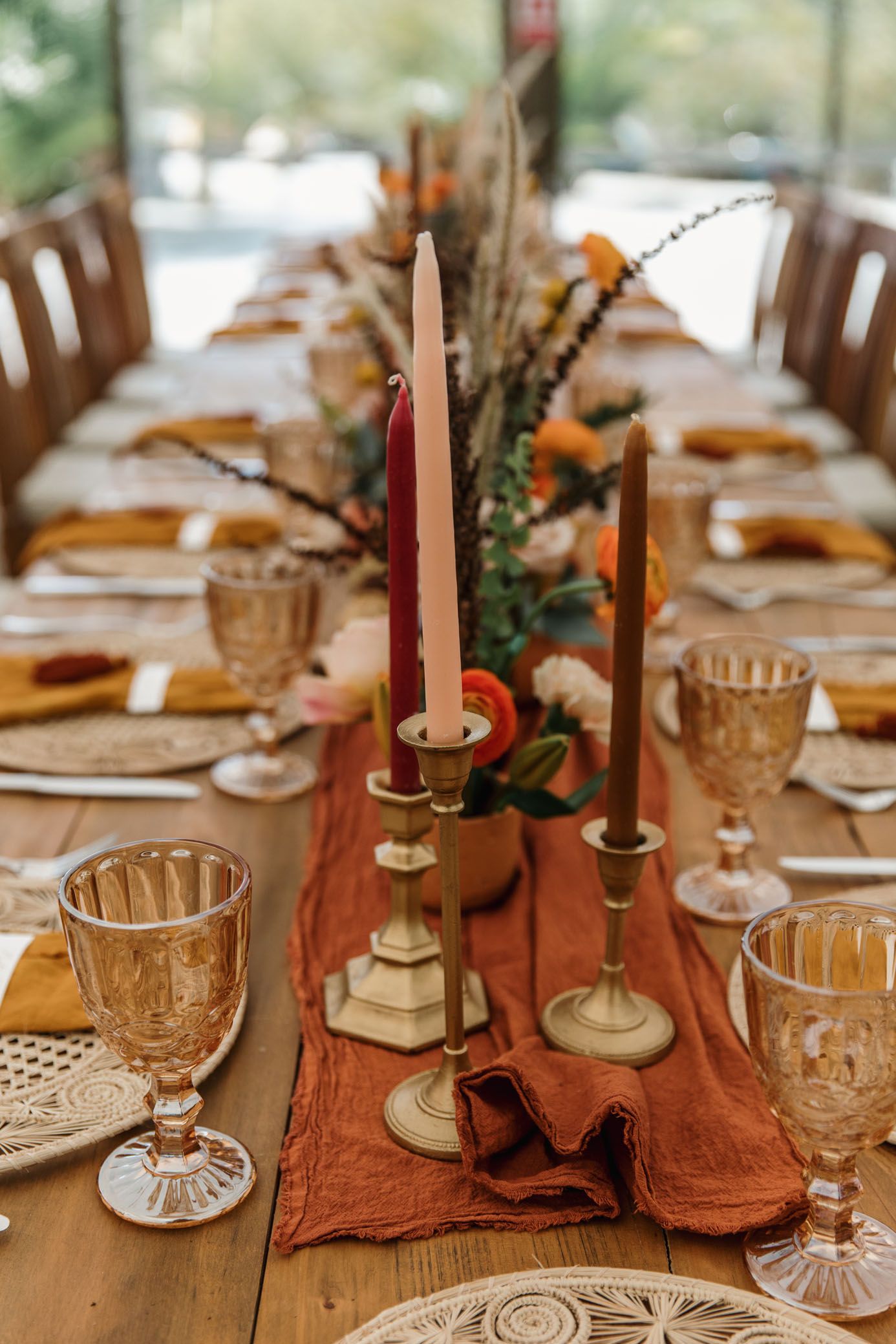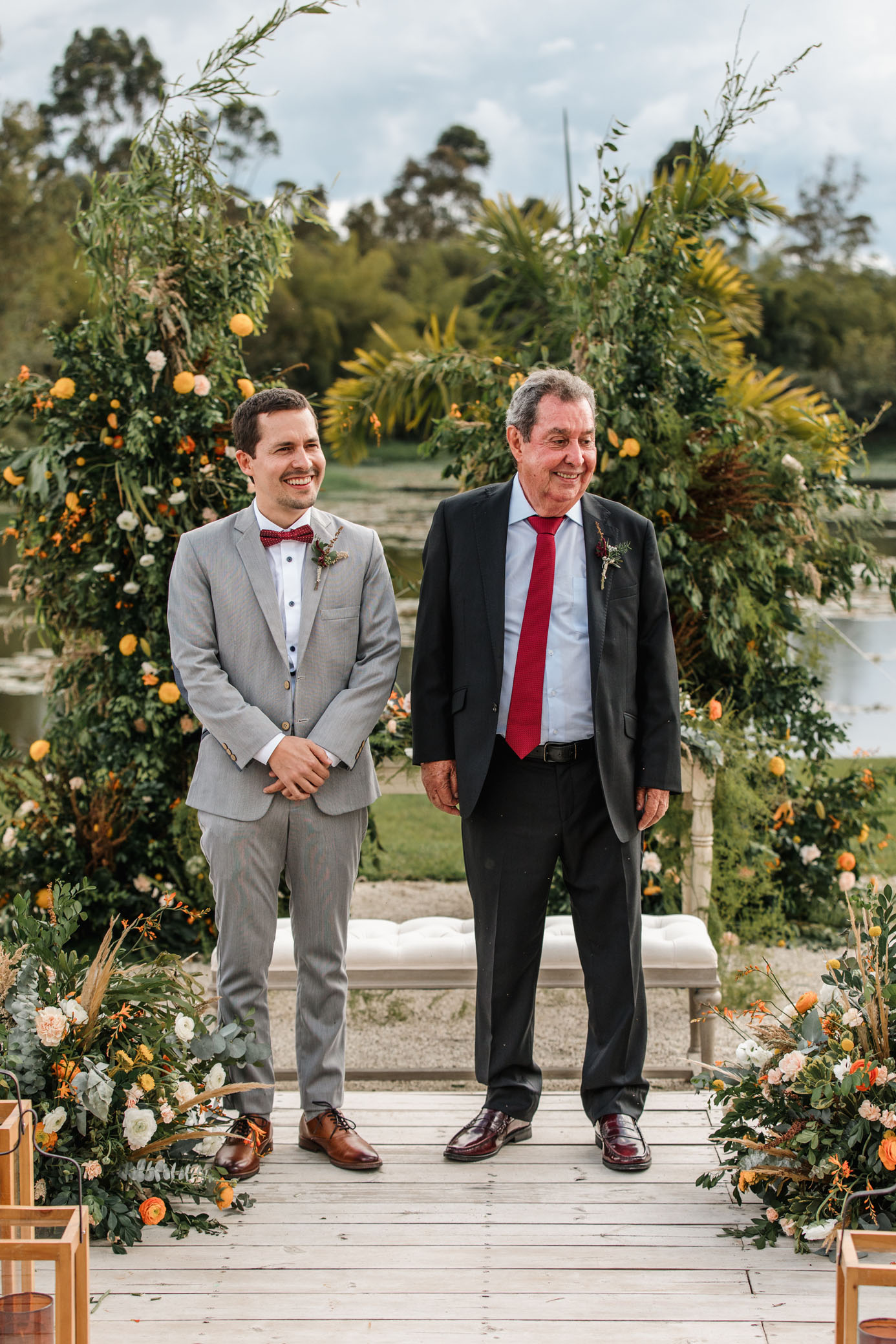 Durante este tiempo, la ansiedad se apoderó de nuevo de Sara, quien no veía la hora de llegar al altar y bailar toda la noche en la fiesta de sus sueños. Para entretenerse y hacer más llevadera la espera, tiñó todas las servilletas que usarían en la comida la noche de la fiesta. Caro Chica, amiga y cuñada de su esposo, fue su cómplice y apoyo en el diseño de la decoración, que incluyó rosas rosadas y ranúnculos anaranjados, faroles de mimbre, recipientes en barro, candelabros dorados, botellas de vidrio, velas de color rojo y caminos de mesa terracota sobre las mesas. Un ambiente otoñal que asemejaba la escena del día de la pedida de mano, con muchas hojas, mucho verde. Lo cálido y lo sencillo como fórmula ganadora. Por supuesto, también las servilletas color mostaza teñidas meses antes a manera de terapia y meditación mientras llegaba el día. No fue tampoco el 21 de marzo. Por diferentes motivos la boda se aplazó para el 6 de junio del 2021. Y ese día por fin llegó.