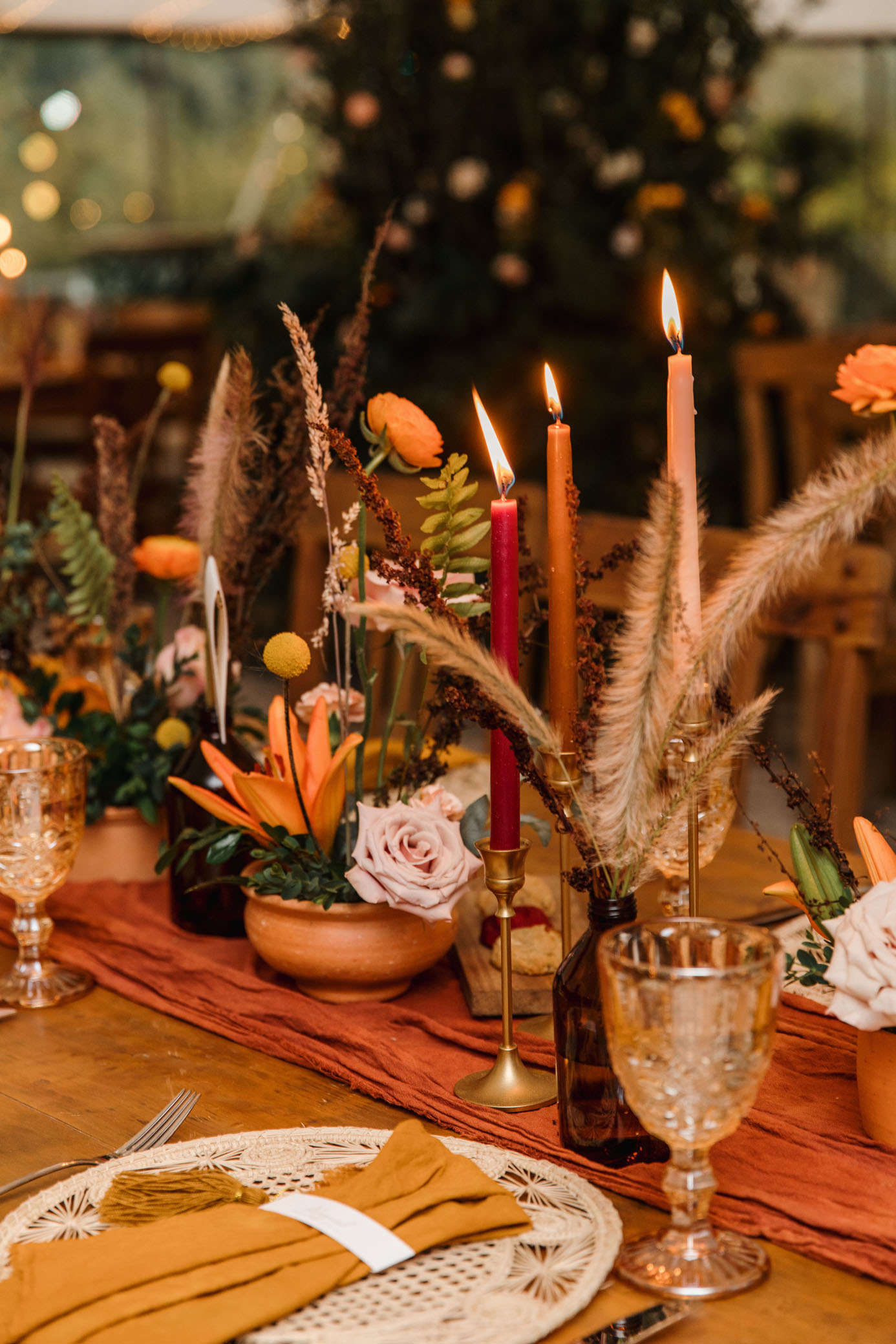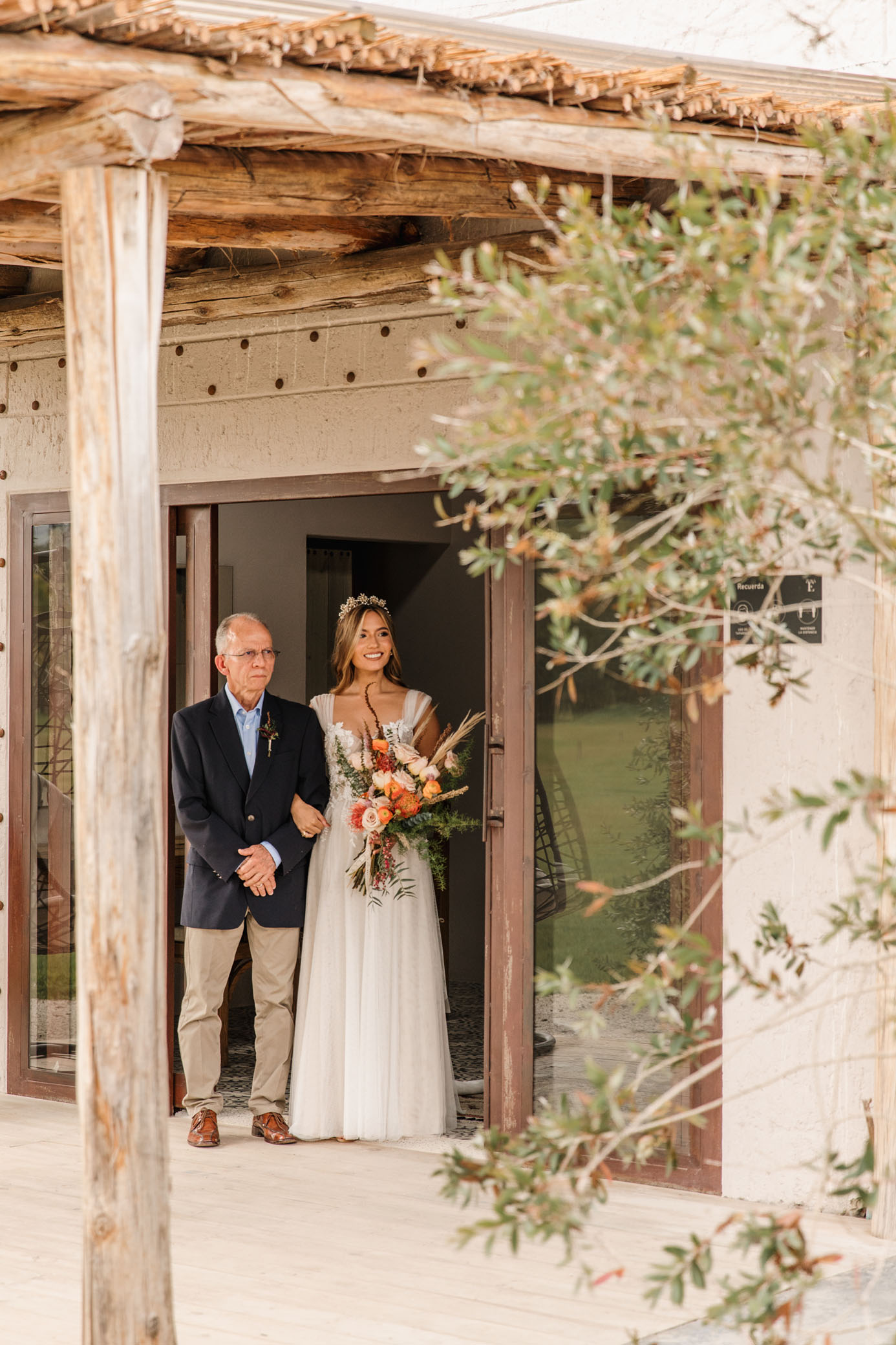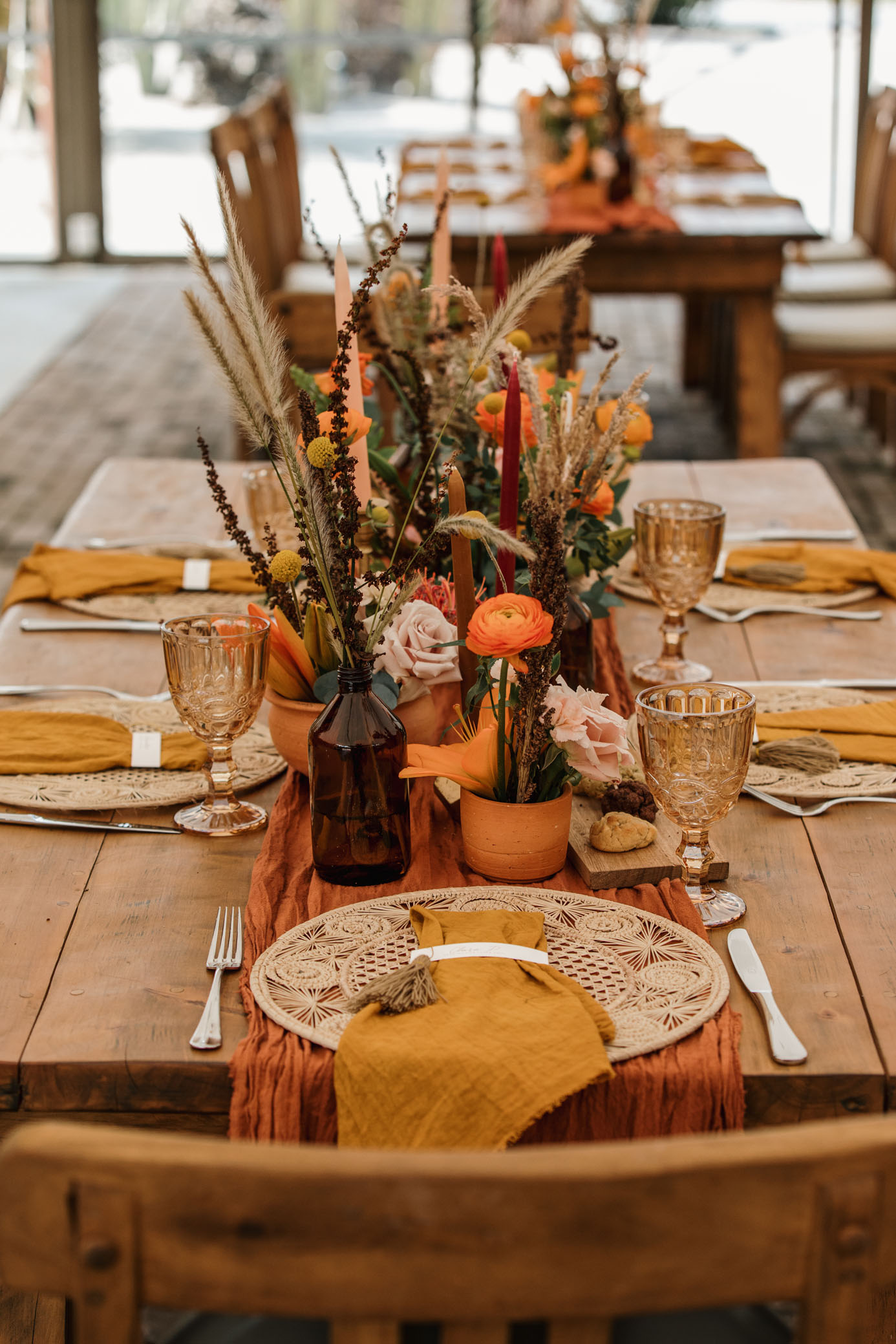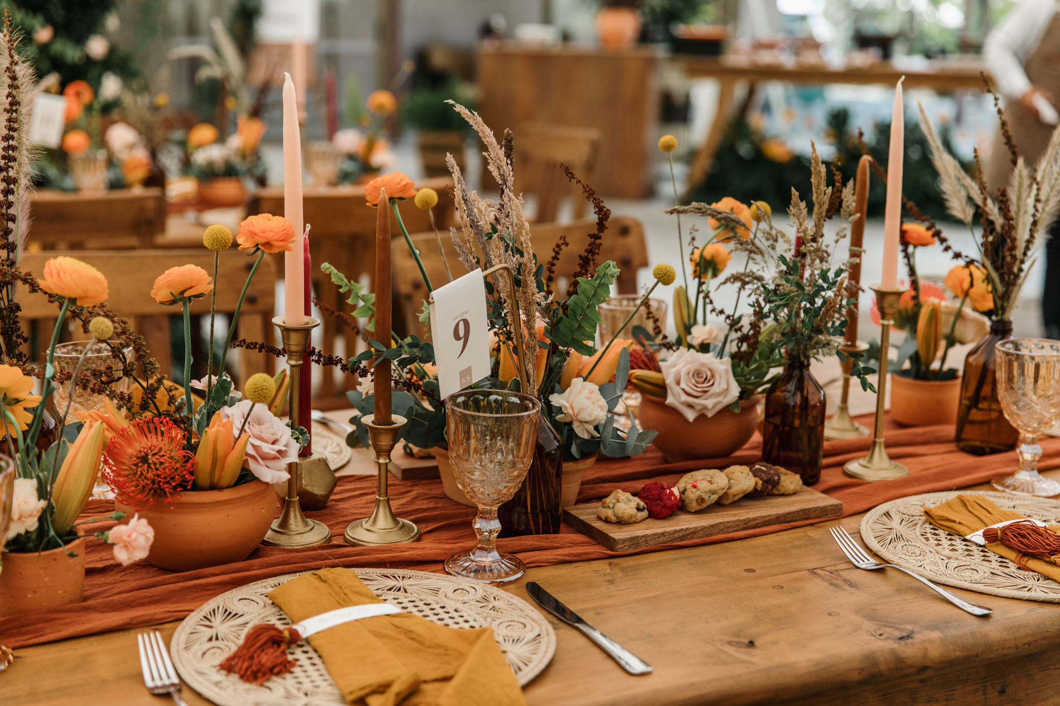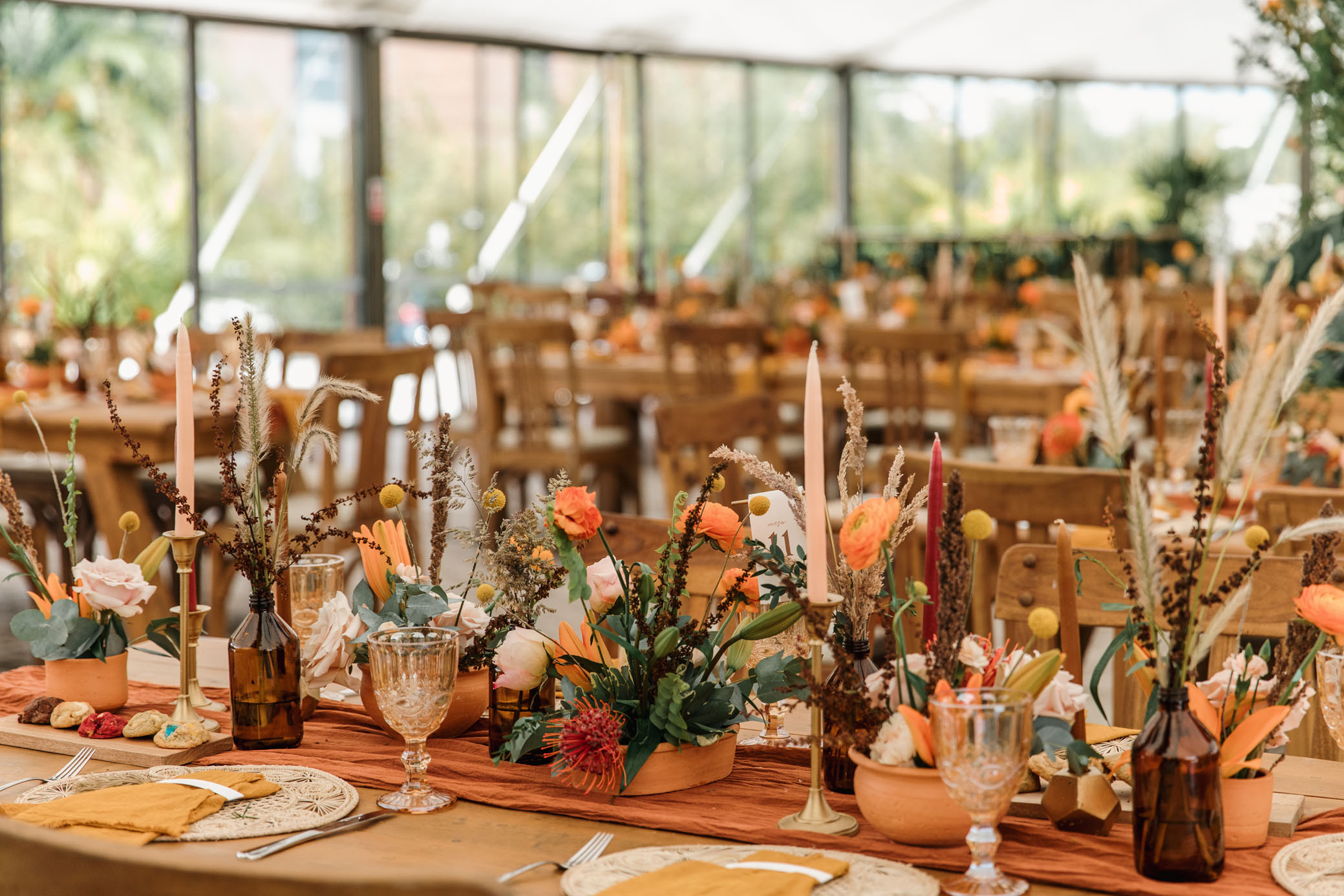 Durante este tiempo, la ansiedad se apoderó de nuevo de Sara, quien no veía la hora de llegar al altar y bailar toda la noche en la fiesta de sus sueños. Para entretenerse y hacer más llevadera la espera, tiñó todas las servilletas que usarían en la comida la noche de la fiesta. Caro Chica, amiga y cuñada de su esposo, fue su cómplice y apoyo en el diseño de la decoración, que incluyó rosas rosadas y ranúnculos anaranjados, faroles de mimbre, recipientes en barro, candelabros dorados, botellas de vidrio, velas de color rojo y caminos de mesa terracota sobre las mesas. Un ambiente otoñal que asemejaba la escena del día de la pedida de mano, con muchas hojas, mucho verde. Lo cálido y lo sencillo como fórmula ganadora. Por supuesto, también las servilletas color mostaza teñidas meses antes a manera de terapia y meditación mientras llegaba el día. No fue tampoco el 21 de marzo. Por diferentes motivos la boda se aplazó para el 6 de junio del 2021. Y ese día por fin llegó.