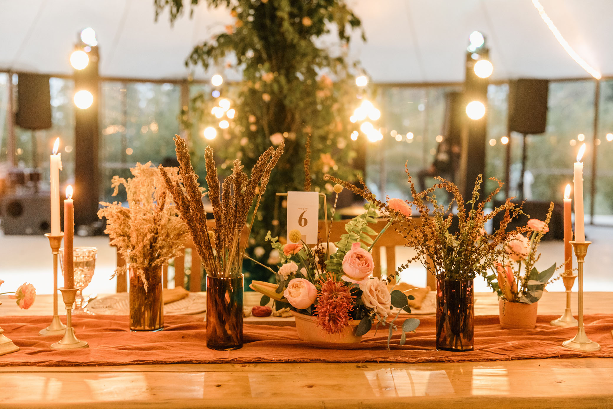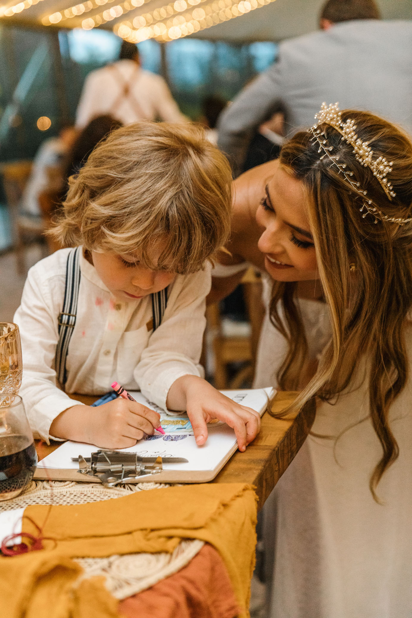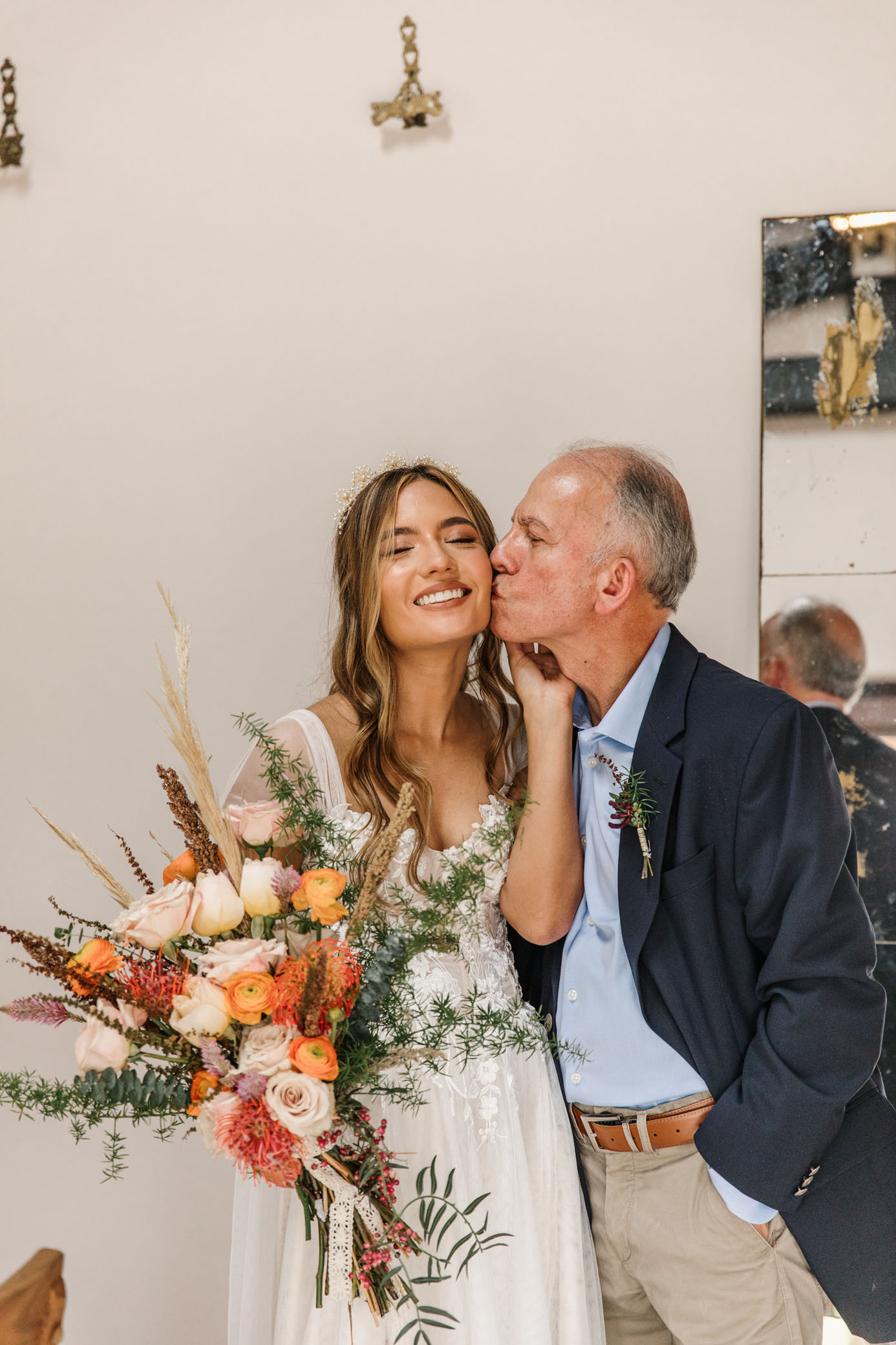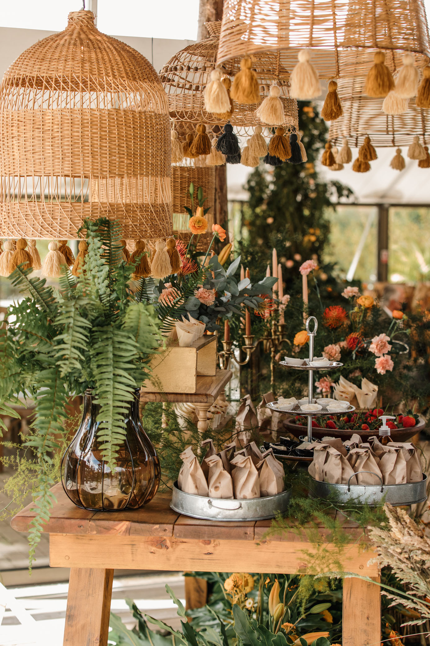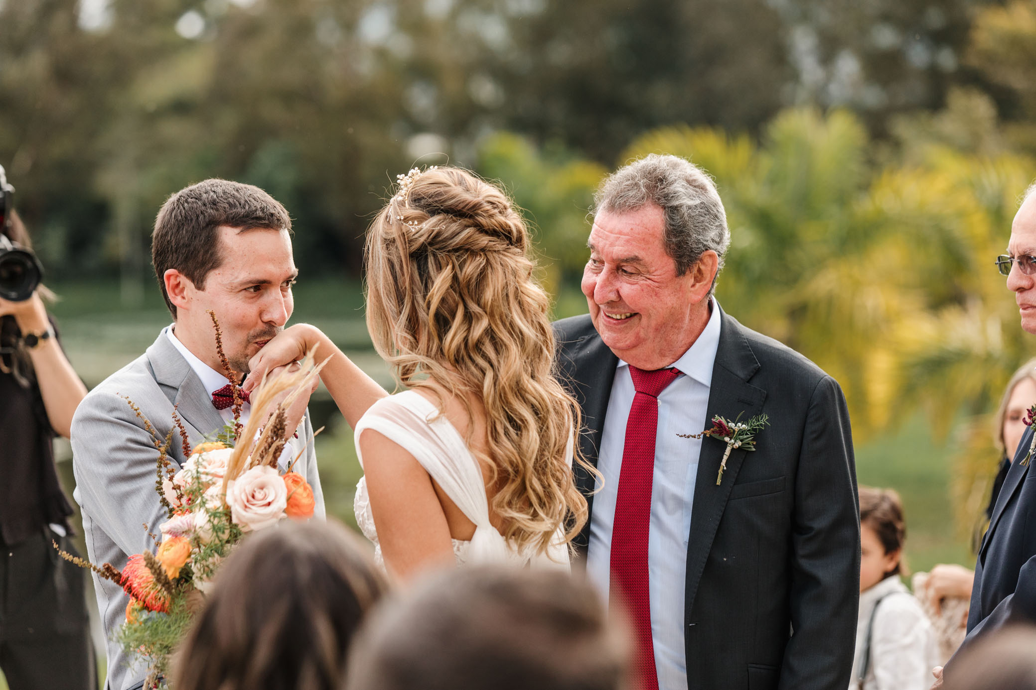 Durante este tiempo, la ansiedad se apoderó de nuevo de Sara, quien no veía la hora de llegar al altar y bailar toda la noche en la fiesta de sus sueños. Para entretenerse y hacer más llevadera la espera, tiñó todas las servilletas que usarían en la comida la noche de la fiesta. Caro Chica, amiga y cuñada de su esposo, fue su cómplice y apoyo en el diseño de la decoración, que incluyó rosas rosadas y ranúnculos anaranjados, faroles de mimbre, recipientes en barro, candelabros dorados, botellas de vidrio, velas de color rojo y caminos de mesa terracota sobre las mesas. Un ambiente otoñal que asemejaba la escena del día de la pedida de mano, con muchas hojas, mucho verde. Lo cálido y lo sencillo como fórmula ganadora. Por supuesto, también las servilletas color mostaza teñidas meses antes a manera de terapia y meditación mientras llegaba el día. No fue tampoco el 21 de marzo. Por diferentes motivos la boda se aplazó para el 6 de junio del 2021. Y ese día por fin llegó.