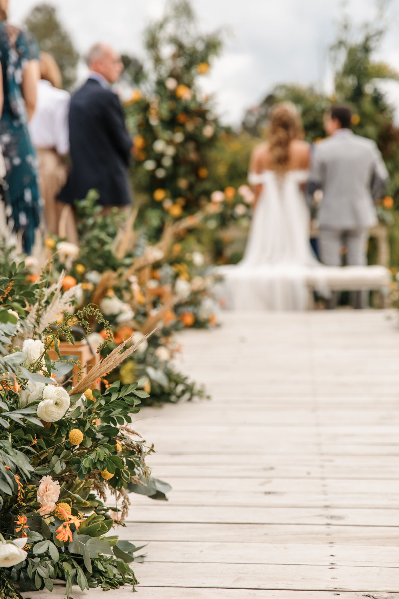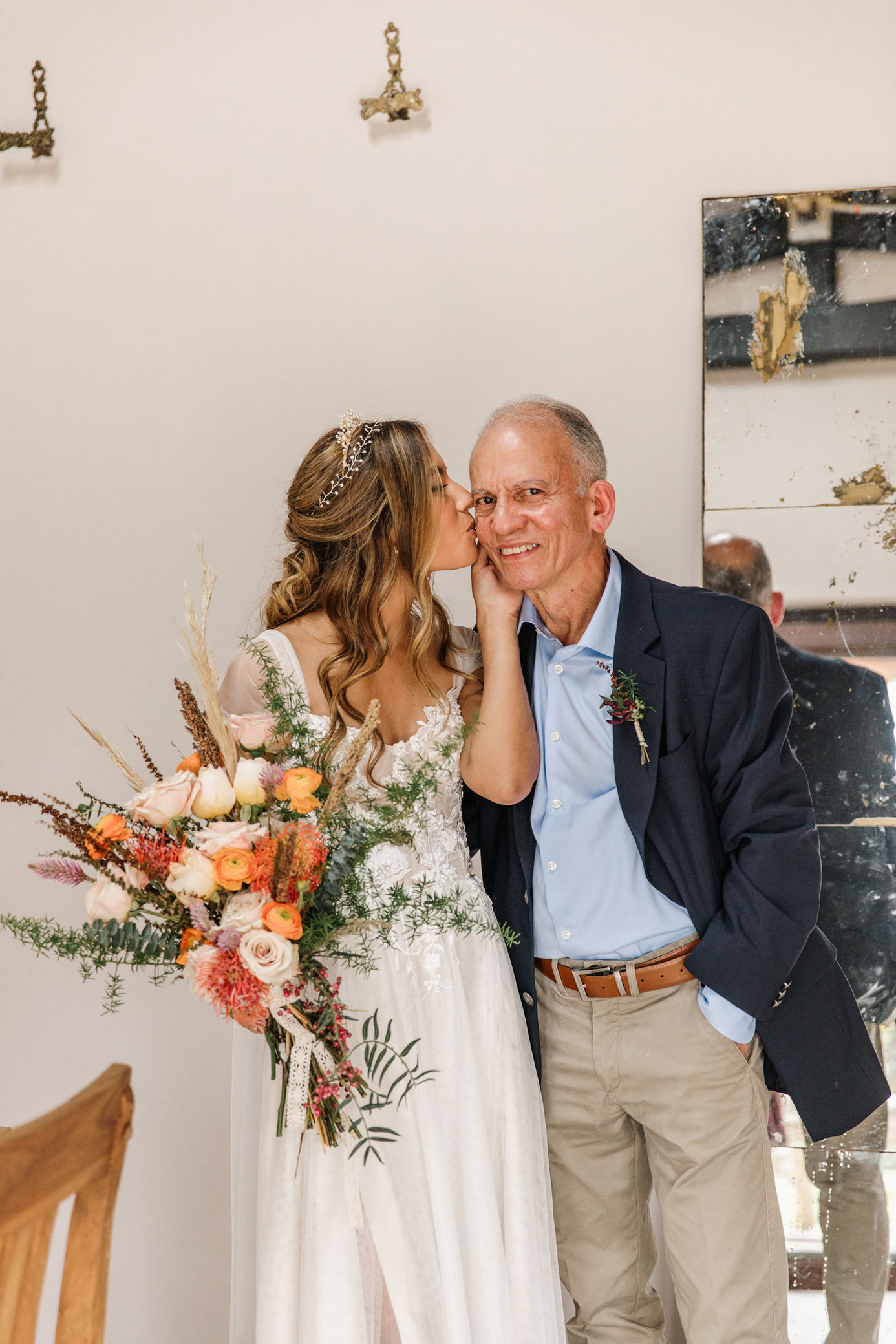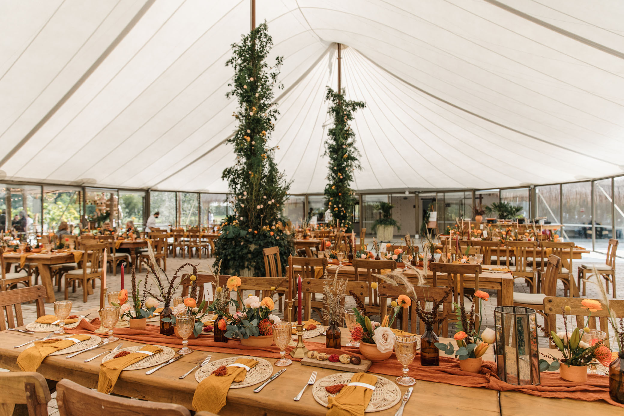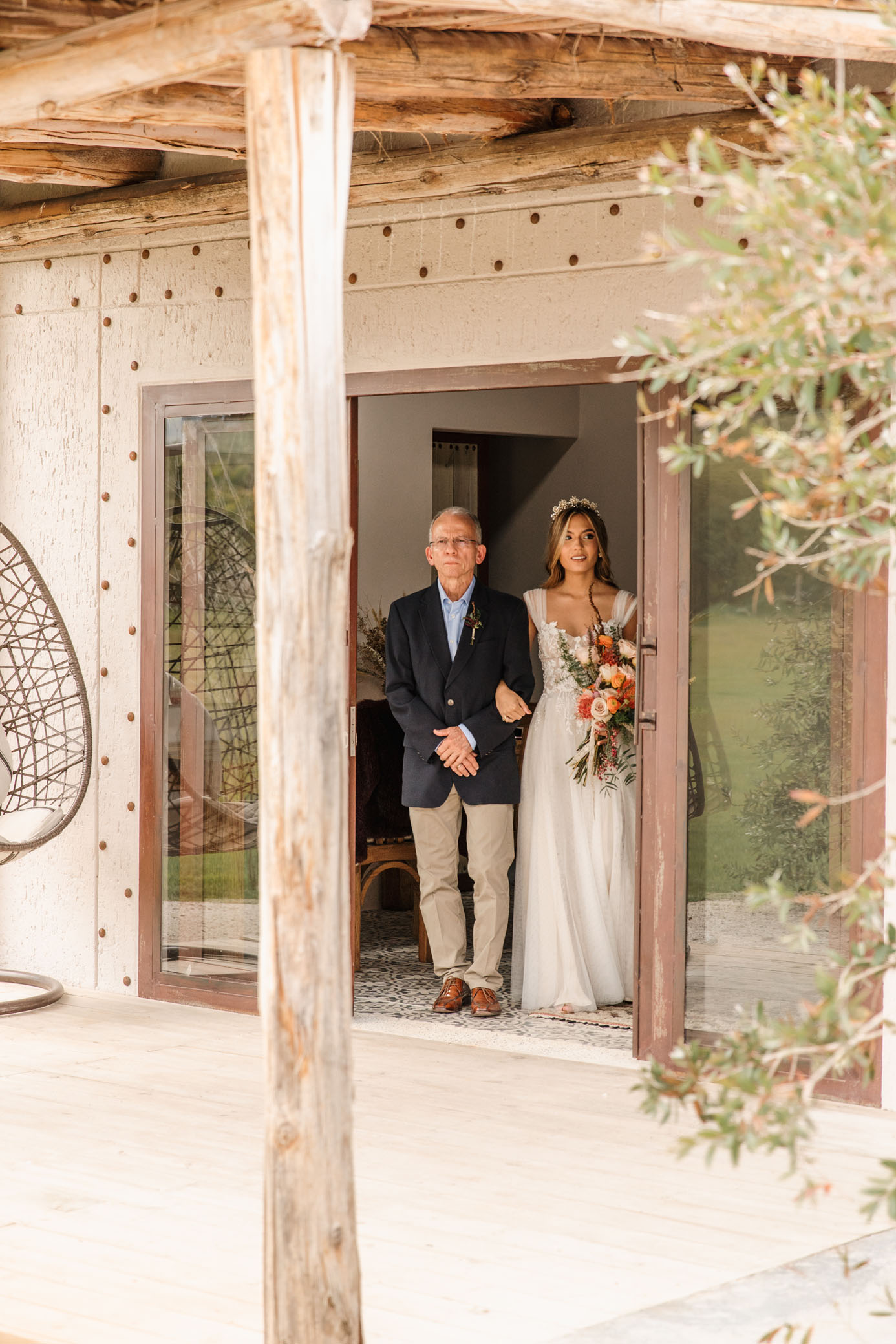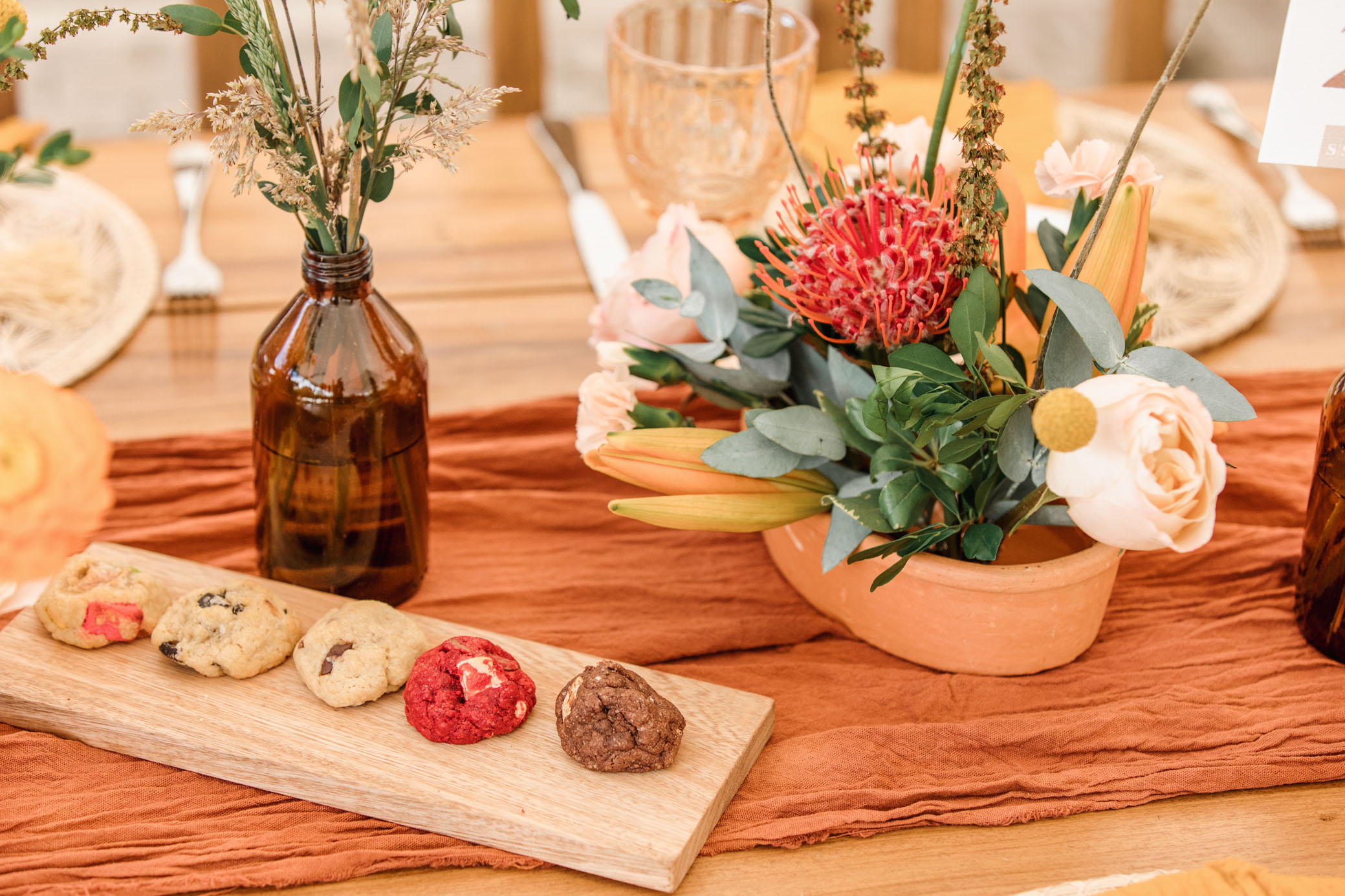 Durante este tiempo, la ansiedad se apoderó de nuevo de Sara, quien no veía la hora de llegar al altar y bailar toda la noche en la fiesta de sus sueños. Para entretenerse y hacer más llevadera la espera, tiñó todas las servilletas que usarían en la comida la noche de la fiesta. Caro Chica, amiga y cuñada de su esposo, fue su cómplice y apoyo en el diseño de la decoración, que incluyó rosas rosadas y ranúnculos anaranjados, faroles de mimbre, recipientes en barro, candelabros dorados, botellas de vidrio, velas de color rojo y caminos de mesa terracota sobre las mesas. Un ambiente otoñal que asemejaba la escena del día de la pedida de mano, con muchas hojas, mucho verde. Lo cálido y lo sencillo como fórmula ganadora. Por supuesto, también las servilletas color mostaza teñidas meses antes a manera de terapia y meditación mientras llegaba el día. No fue tampoco el 21 de marzo. Por diferentes motivos la boda se aplazó para el 6 de junio del 2021. Y ese día por fin llegó.
