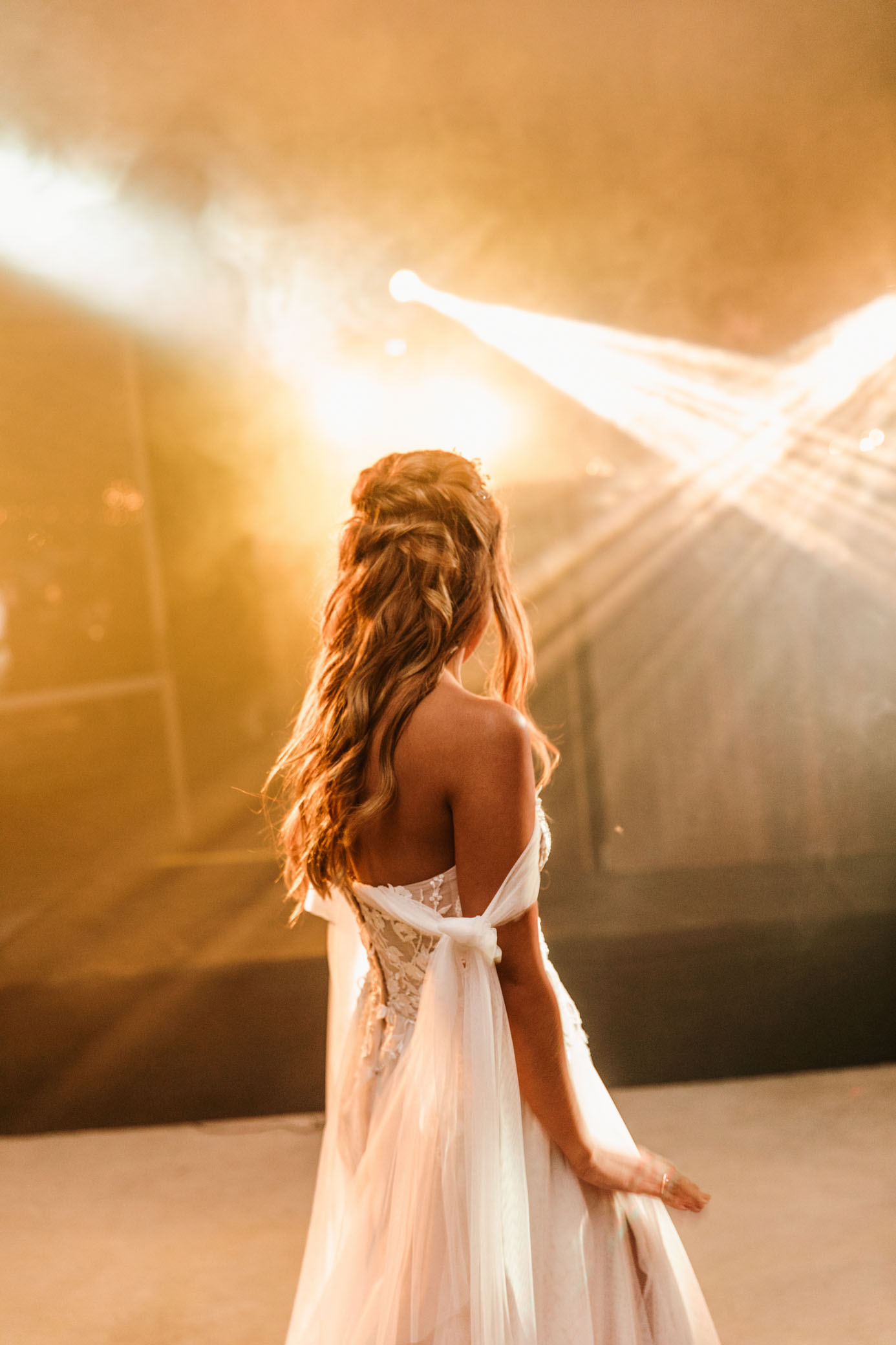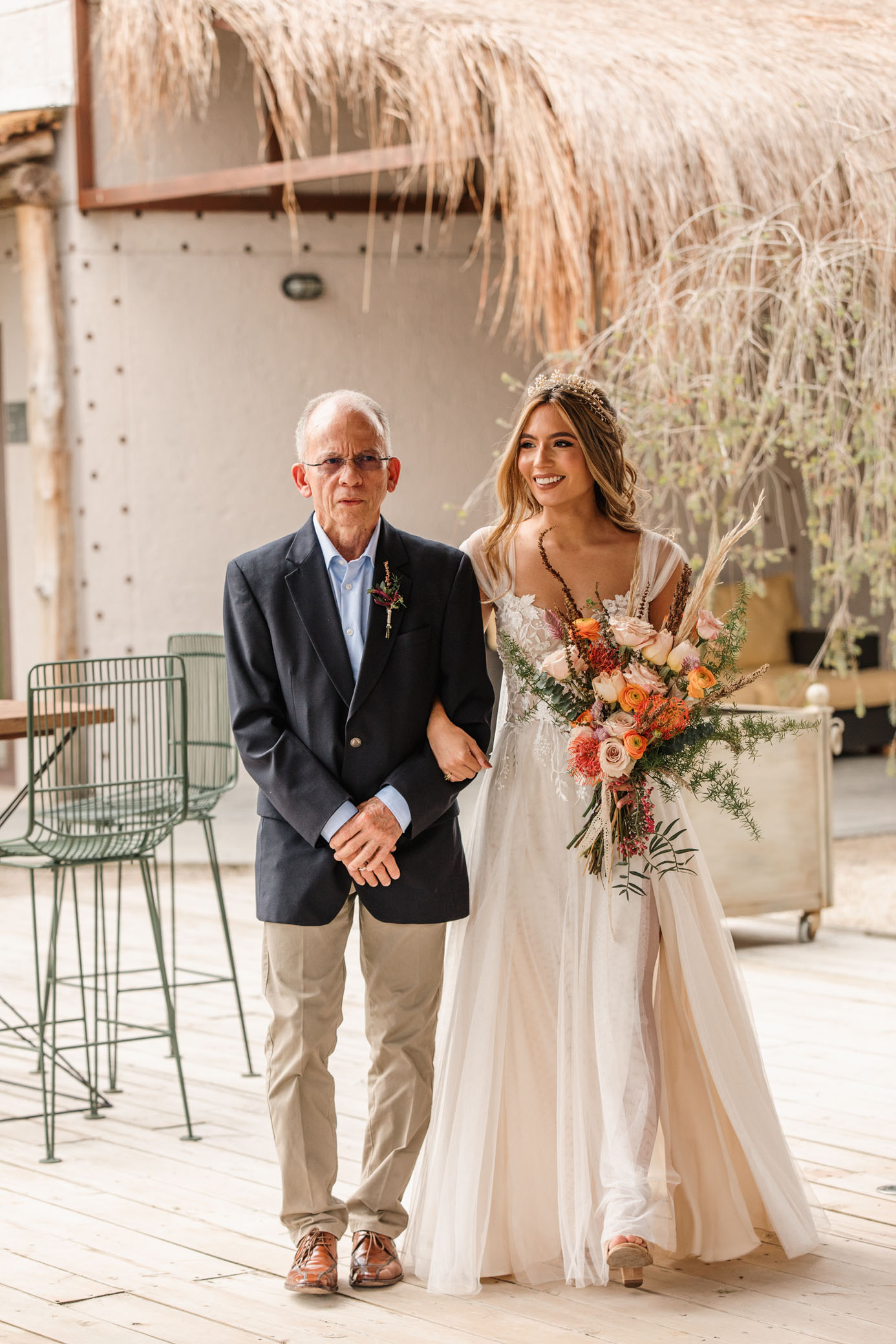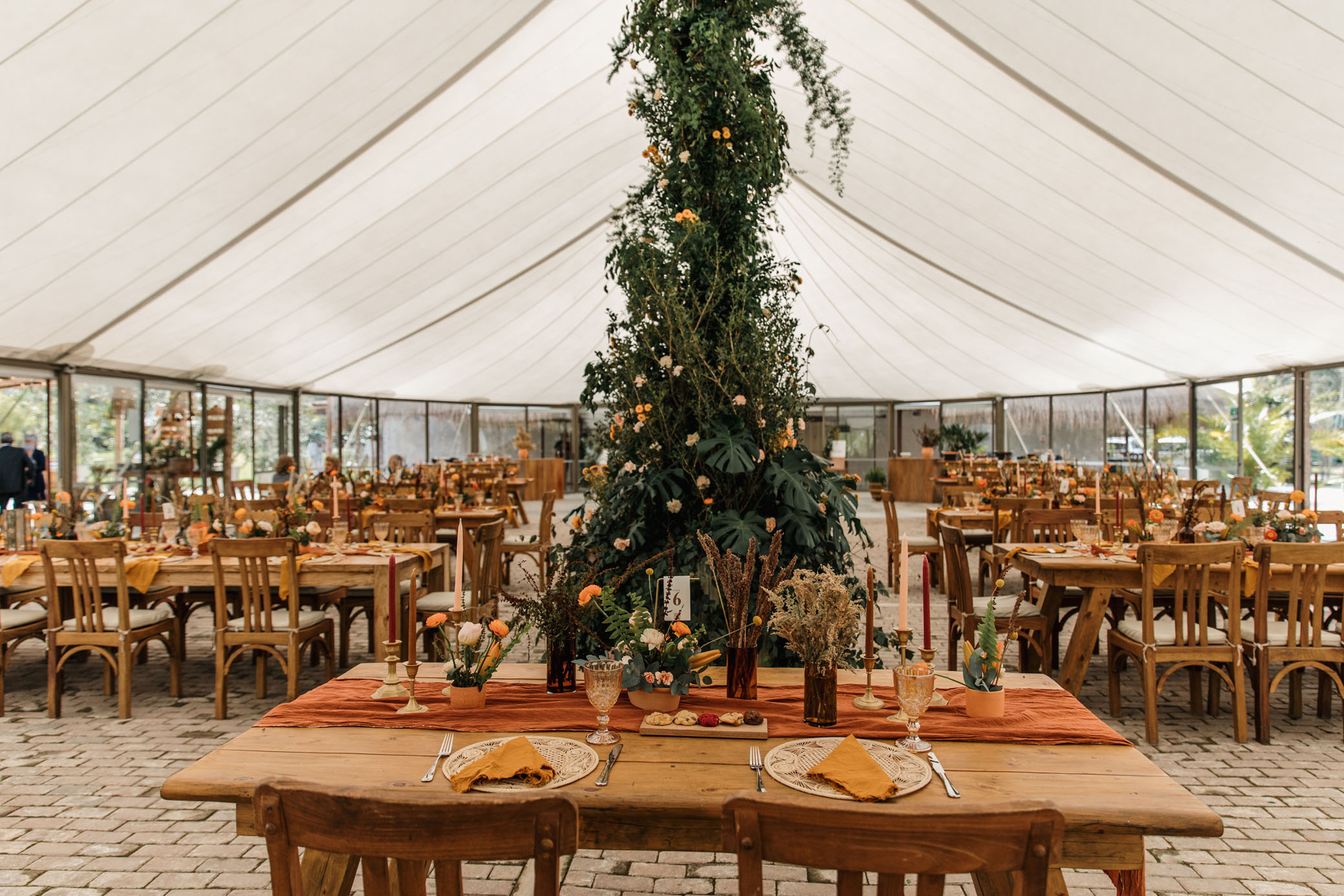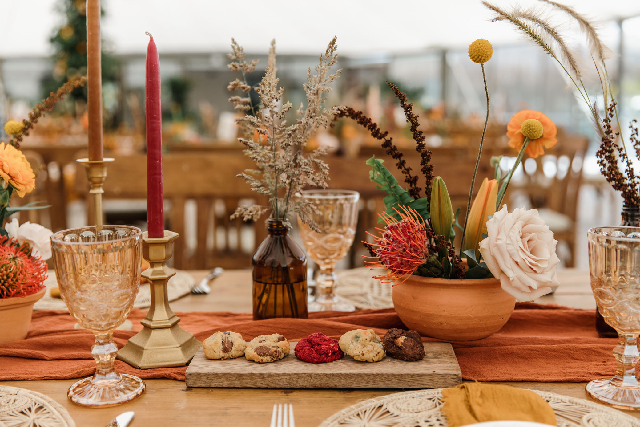 Durante este tiempo, la ansiedad se apoderó de nuevo de Sara, quien no veía la hora de llegar al altar y bailar toda la noche en la fiesta de sus sueños. Para entretenerse y hacer más llevadera la espera, tiñó todas las servilletas que usarían en la comida la noche de la fiesta. Caro Chica, amiga y cuñada de su esposo, fue su cómplice y apoyo en el diseño de la decoración, que incluyó rosas rosadas y ranúnculos anaranjados, faroles de mimbre, recipientes en barro, candelabros dorados, botellas de vidrio, velas de color rojo y caminos de mesa terracota sobre las mesas. Un ambiente otoñal que asemejaba la escena del día de la pedida de mano, con muchas hojas, mucho verde. Lo cálido y lo sencillo como fórmula ganadora. Por supuesto, también las servilletas color mostaza teñidas meses antes a manera de terapia y meditación mientras llegaba el día. No fue tampoco el 21 de marzo. Por diferentes motivos la boda se aplazó para el 6 de junio del 2021. Y ese día por fin llegó.