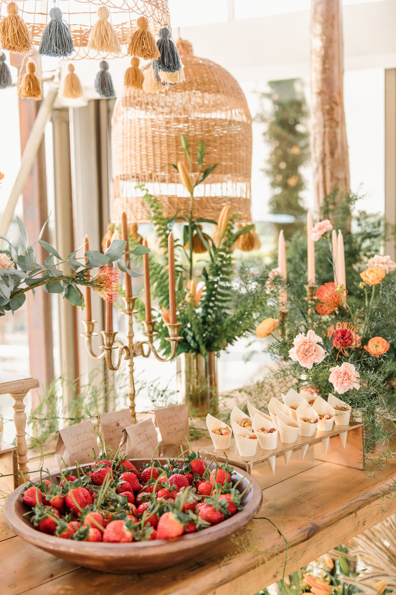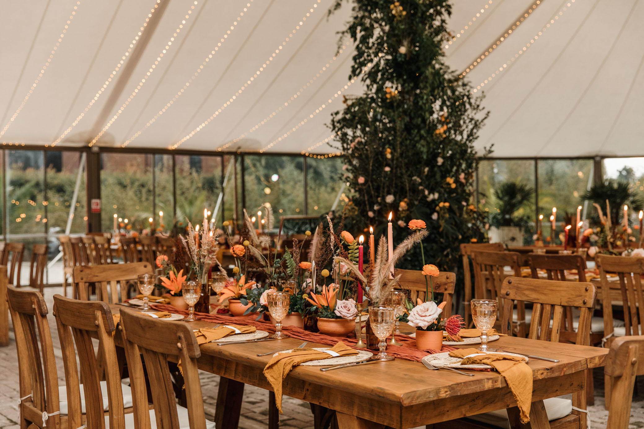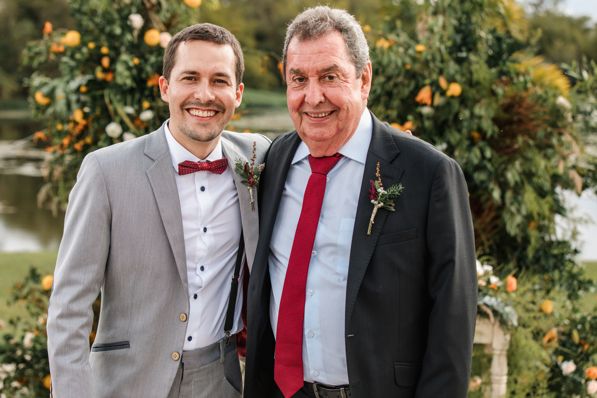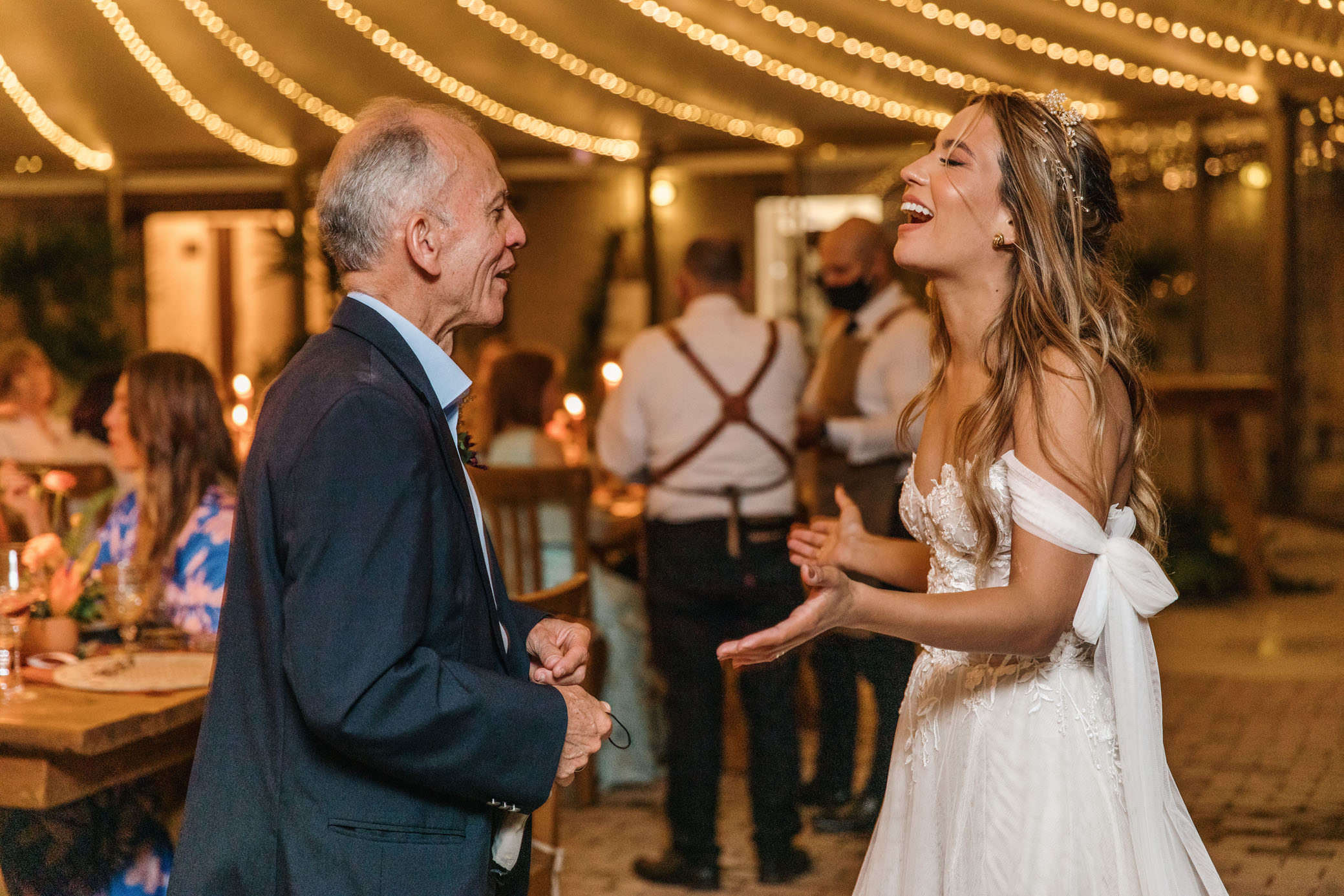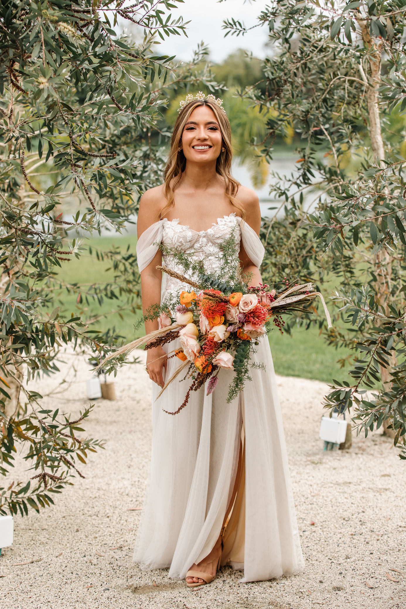Durante este tiempo, la ansiedad se apoderó de nuevo de Sara, quien no veía la hora de llegar al altar y bailar toda la noche en la fiesta de sus sueños. Para entretenerse y hacer más llevadera la espera, tiñó todas las servilletas que usarían en la comida la noche de la fiesta. Caro Chica, amiga y cuñada de su esposo, fue su cómplice y apoyo en el diseño de la decoración, que incluyó rosas rosadas y ranúnculos anaranjados, faroles de mimbre, recipientes en barro, candelabros dorados, botellas de vidrio, velas de color rojo y caminos de mesa terracota sobre las mesas. Un ambiente otoñal que asemejaba la escena del día de la pedida de mano, con muchas hojas, mucho verde. Lo cálido y lo sencillo como fórmula ganadora. Por supuesto, también las servilletas color mostaza teñidas meses antes a manera de terapia y meditación mientras llegaba el día. No fue tampoco el 21 de marzo. Por diferentes motivos la boda se aplazó para el 6 de junio del 2021. Y ese día por fin llegó.