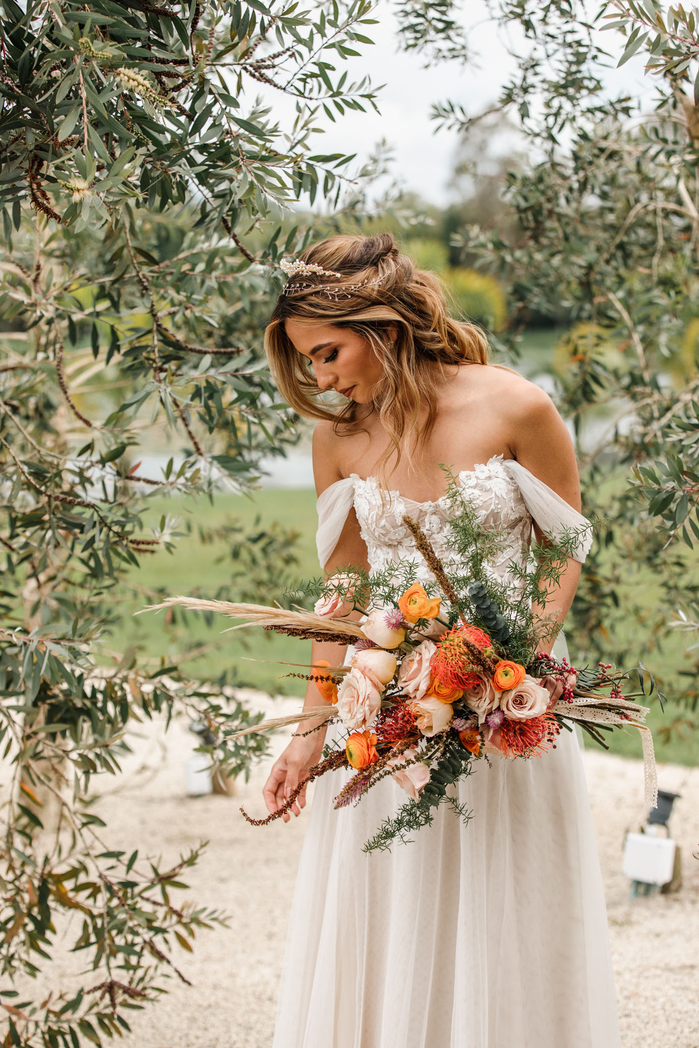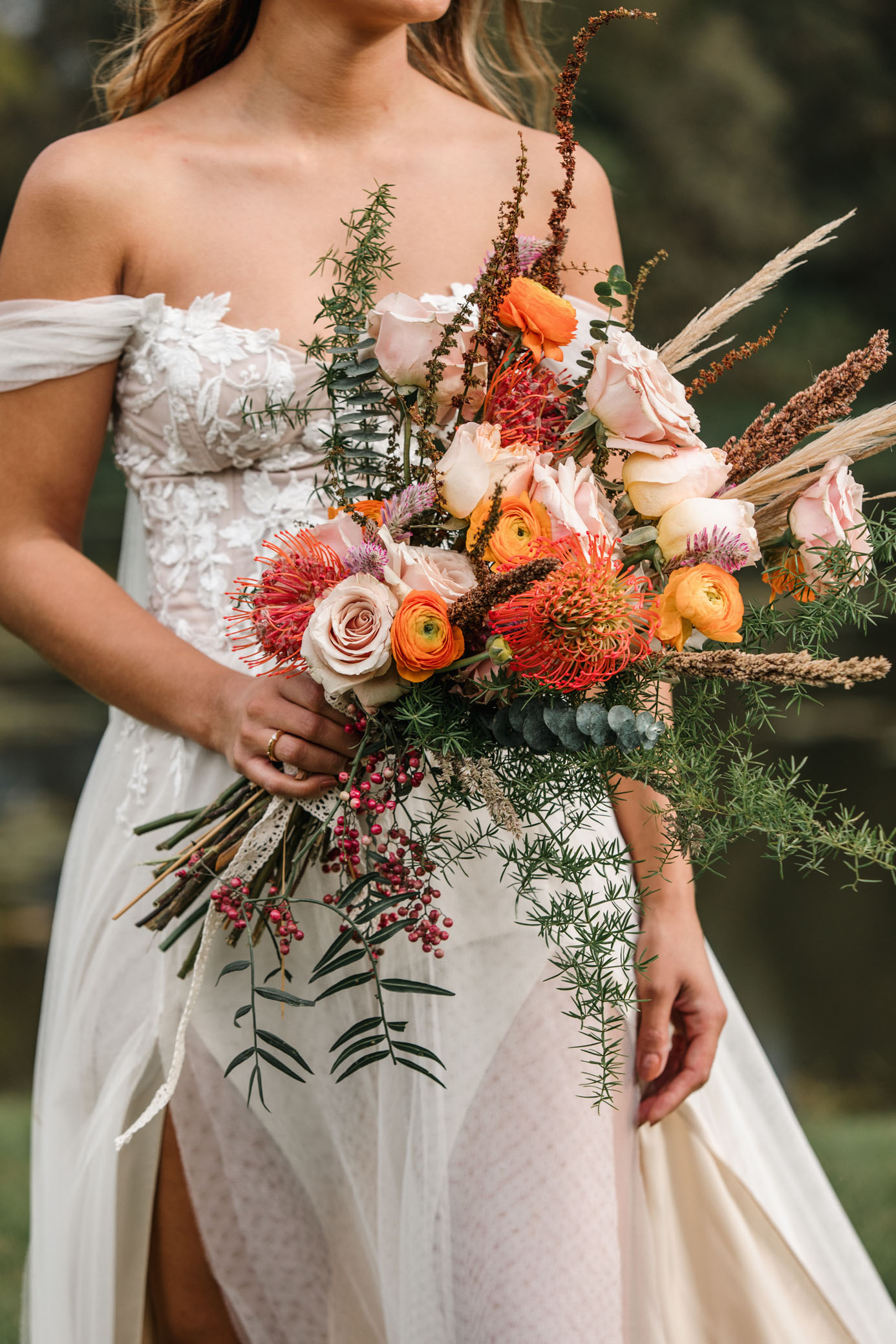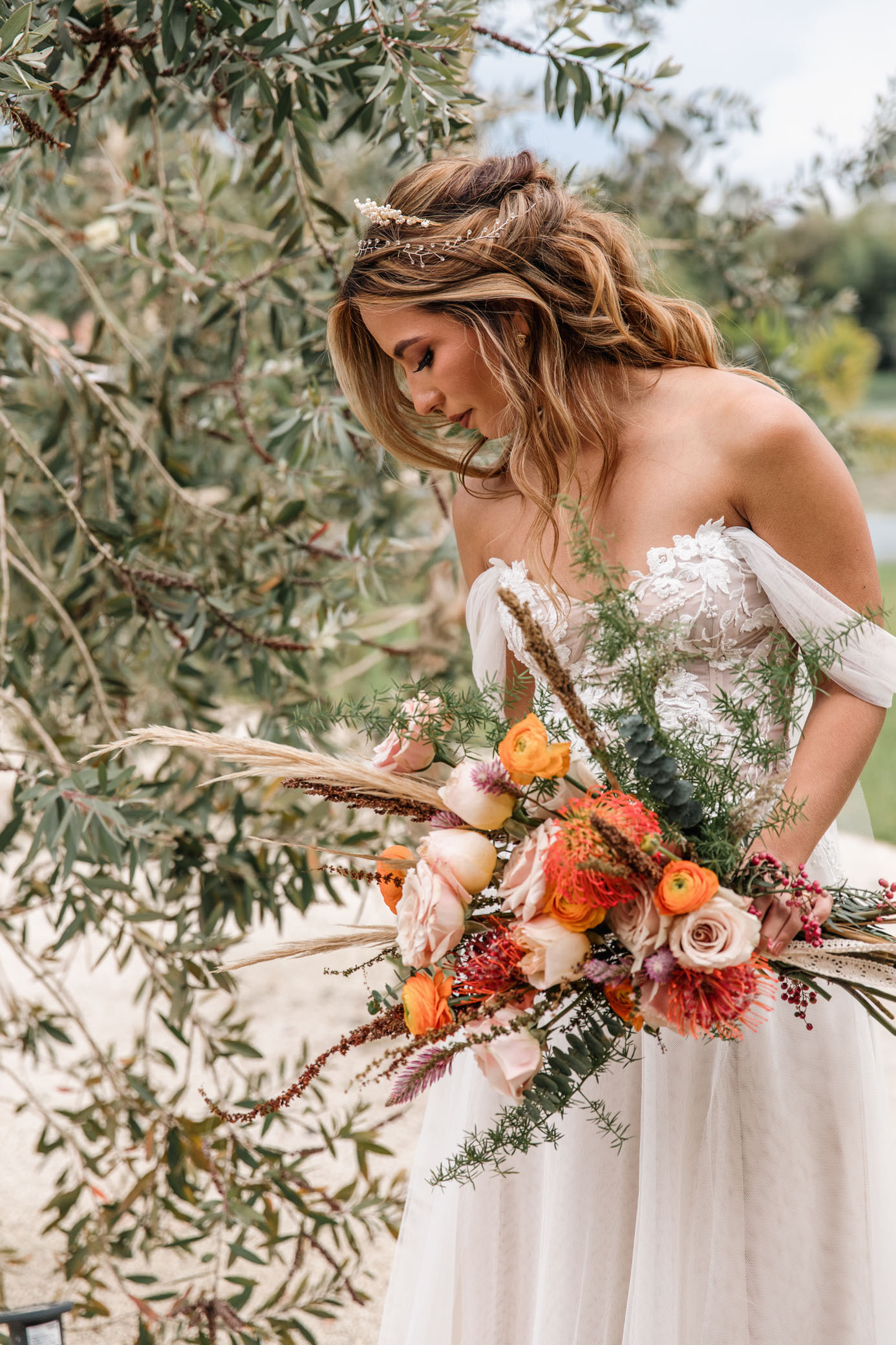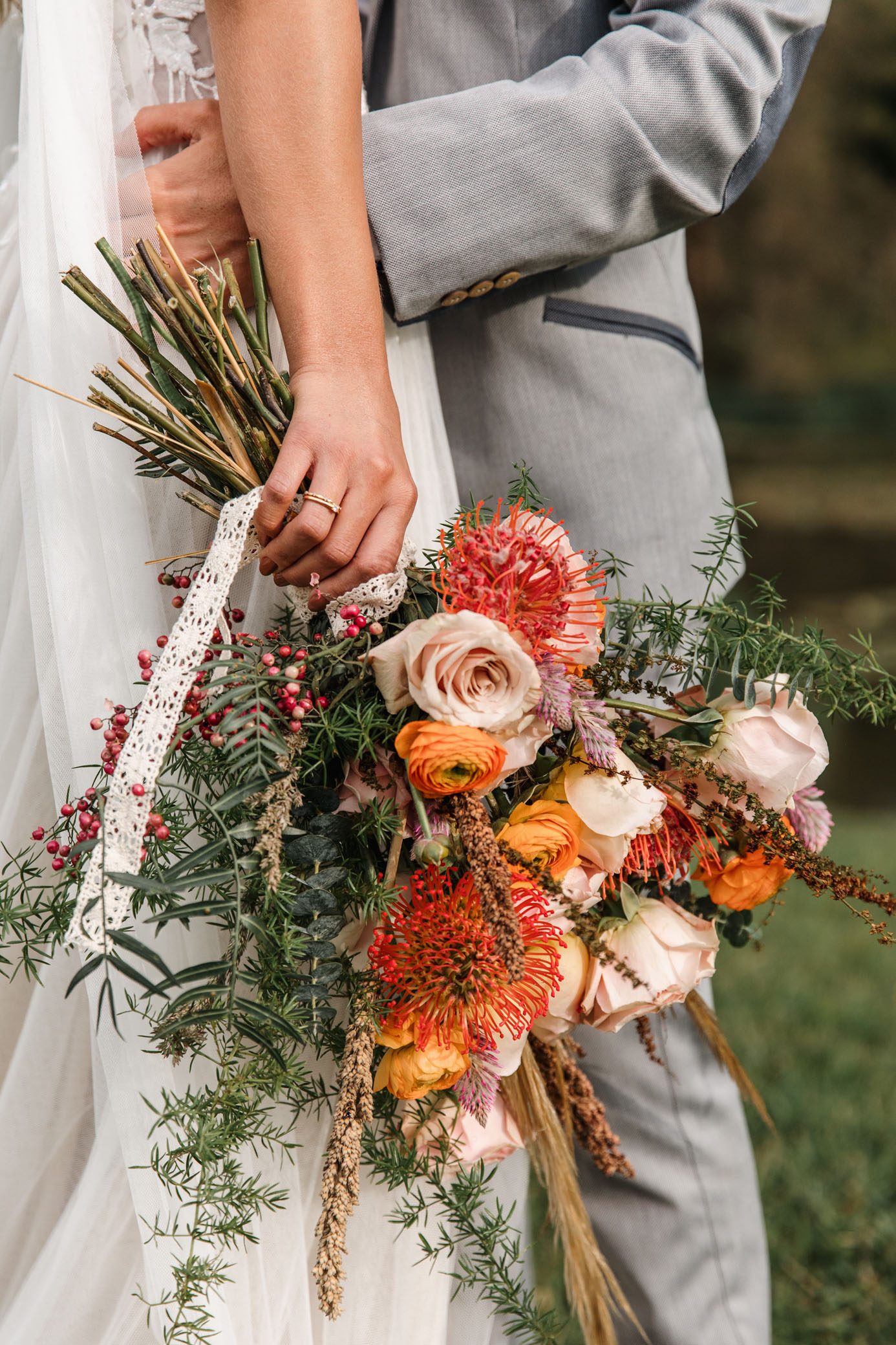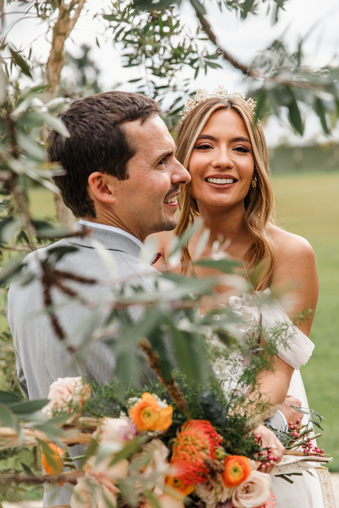 Durante este tiempo, la ansiedad se apoderó de nuevo de Sara, quien no veía la hora de llegar al altar y bailar toda la noche en la fiesta de sus sueños. Para entretenerse y hacer más llevadera la espera, tiñó todas las servilletas que usarían en la comida la noche de la fiesta. Caro Chica, amiga y cuñada de su esposo, fue su cómplice y apoyo en el diseño de la decoración, que incluyó rosas rosadas y ranúnculos anaranjados, faroles de mimbre, recipientes en barro, candelabros dorados, botellas de vidrio, velas de color rojo y caminos de mesa terracota sobre las mesas. Un ambiente otoñal que asemejaba la escena del día de la pedida de mano, con muchas hojas, mucho verde. Lo cálido y lo sencillo como fórmula ganadora. Por supuesto, también las servilletas color mostaza teñidas meses antes a manera de terapia y meditación mientras llegaba el día. No fue tampoco el 21 de marzo. Por diferentes motivos la boda se aplazó para el 6 de junio del 2021. Y ese día por fin llegó.