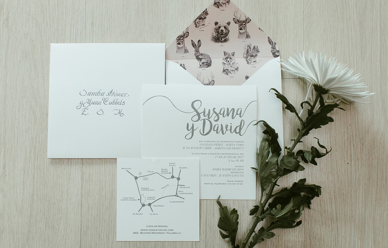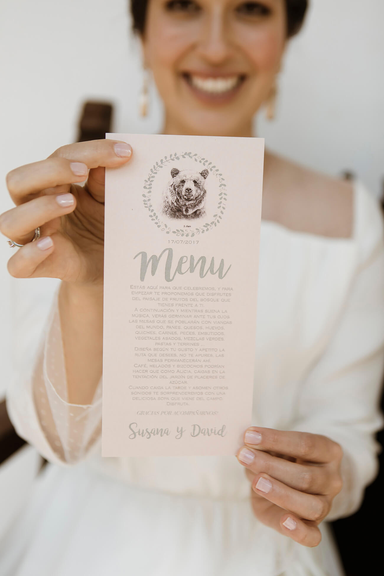 Ciervos, liebres, ardillas, zorros y osos. Estos habitantes del bosque, ilustrados por su mejor amiga –con cierto aire enciclopédico–, estuvieron presentes en las tarjetas del menú y las invitaciones. “El animal principal es un oso grizzly. David es ‘mi oso grizzly’ y yo soy una osa de anteojos jajajaja… La mayoría de los invitados no lo sabían, pero para nosotros era importante que el matrimonio tuviera toda la simbología”.