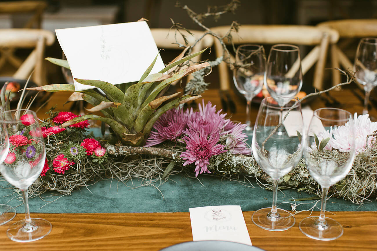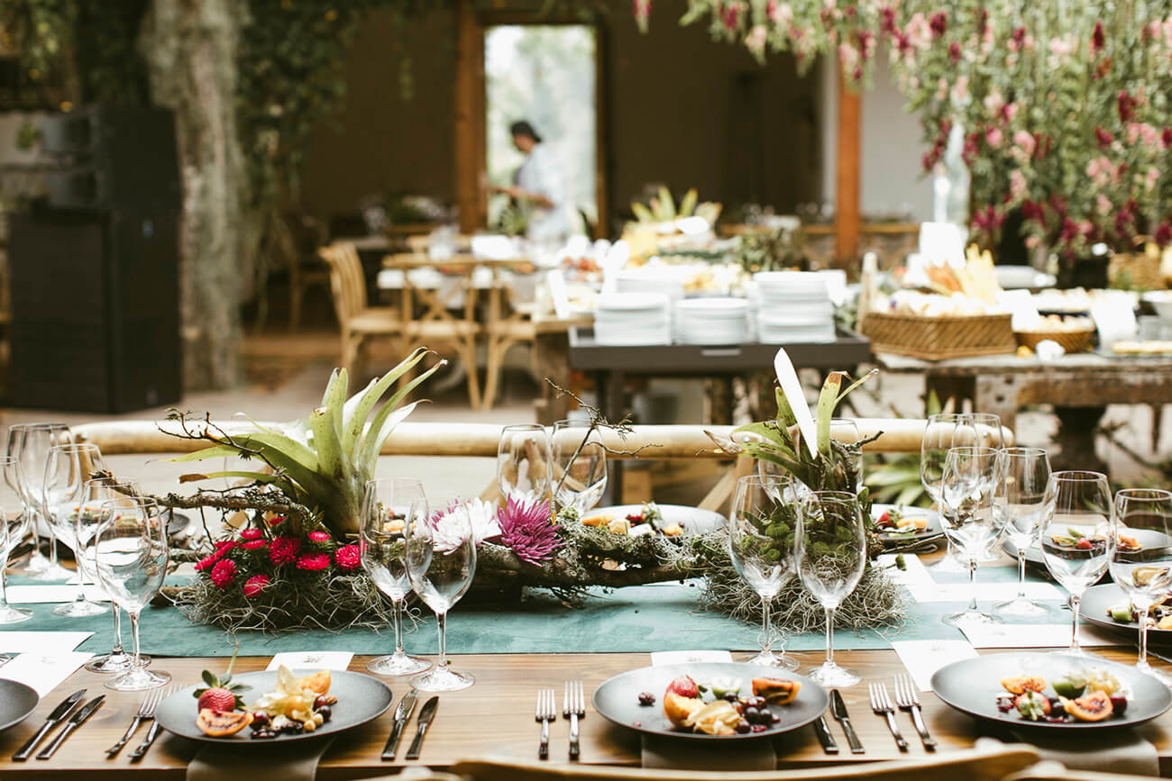 “En los centros de mesa no abundaba la flor, estaban hechos de ramas ‘arrancadas’ al entrar a ese bosque imaginario. Cada rama tenía sus líquenes y bromelias adheridas. Eran centros muy orgánicos que se deslizaban por las mesas. Decidí ubicarlos –detalla Julián Posada– sobre unos caminos de terciopelo verde oscuro para, con estos, solucionar visualmente el follaje y construir un apoyo para los platos que eran negros y los cubiertos”.
