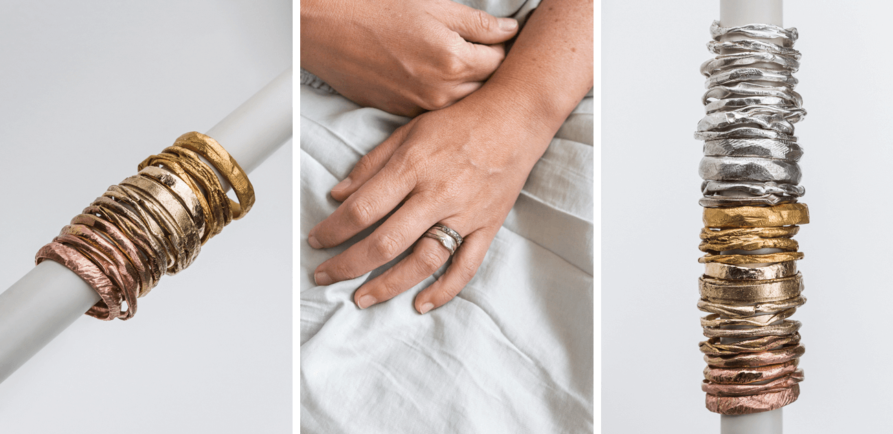 El arte que hay en su joyería (el proceso incluye dibujos, prototipos en cera, fundición, pulir a mano, engastar —que es fijar la piedra—, pintar) es proporcional a la mística que hay en ella. Circunferencias irregulares, materiales utilizados en su aspecto natural (cobre), metales reutilizados o reciclados (plata), procesos ambientalmente responsables (oro verde) y piedras (piritas, aguamarinas, topacios, peridoto) que se alejan del estereotipo, son algunos de los insumos con los que ella cuenta historias.