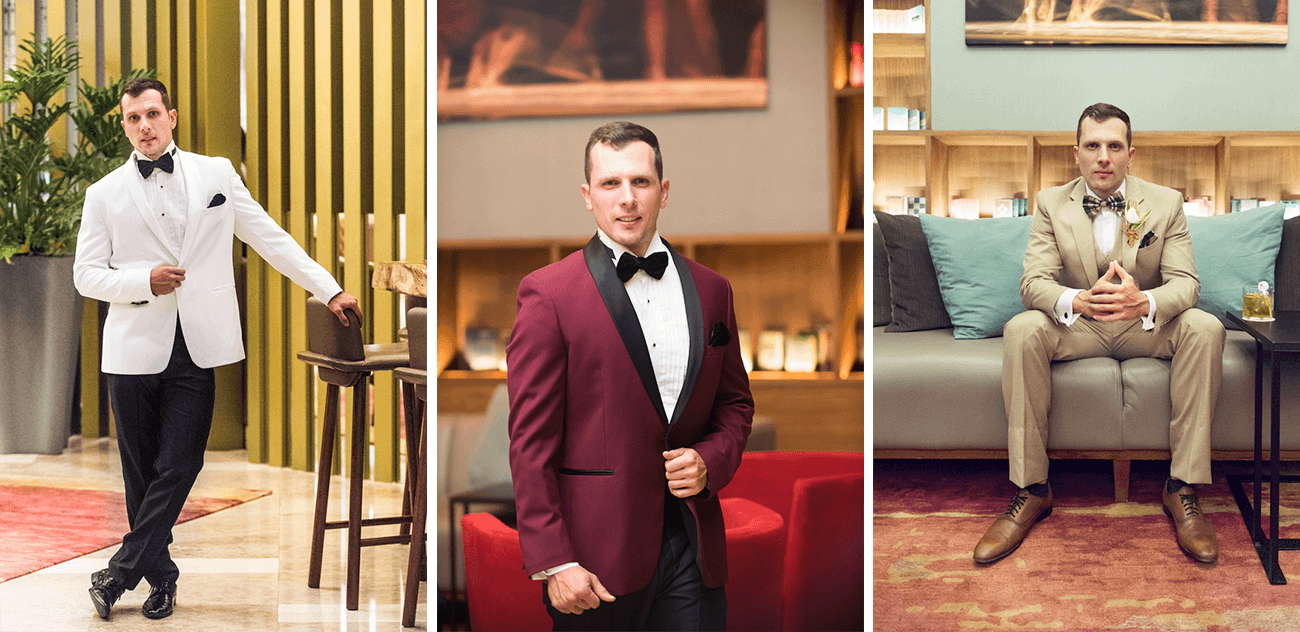 ¿Para ellos? Todavía más. Esmoquin clásico o slim-fit. Esmoquin tropical, porque hay playa de por medio. Corbatas fondo entero, texturizadas, delgadas o semi. Corbatines formales y arriesgados. ¿Para el novio? Por supuesto, el traje de lujo. Hechos en lanas de 120 y 140, es decir, finas, sedosas, suaves al tacto, exclusivas. Hay azules, grises, negros; desde la talla 32 hasta la 52. En medidas short, regular y long según la altura.