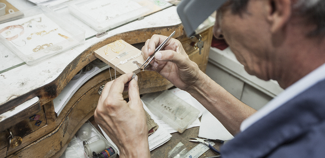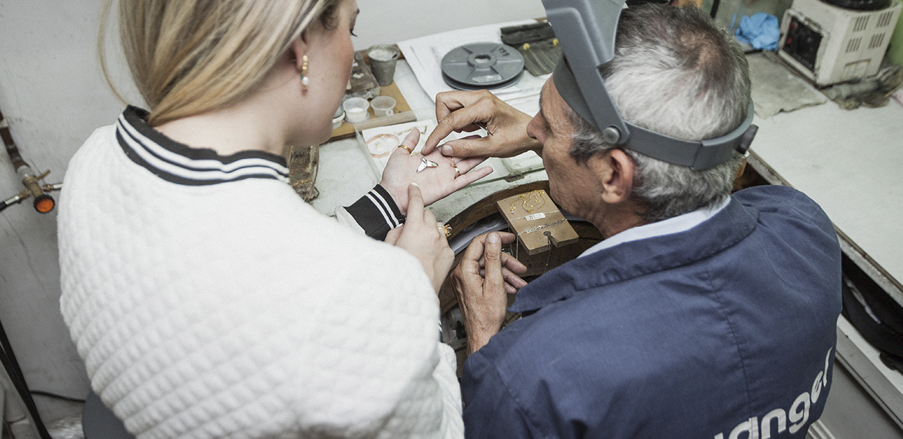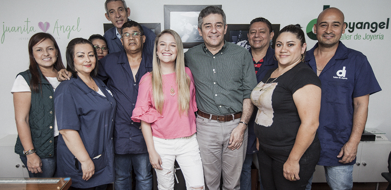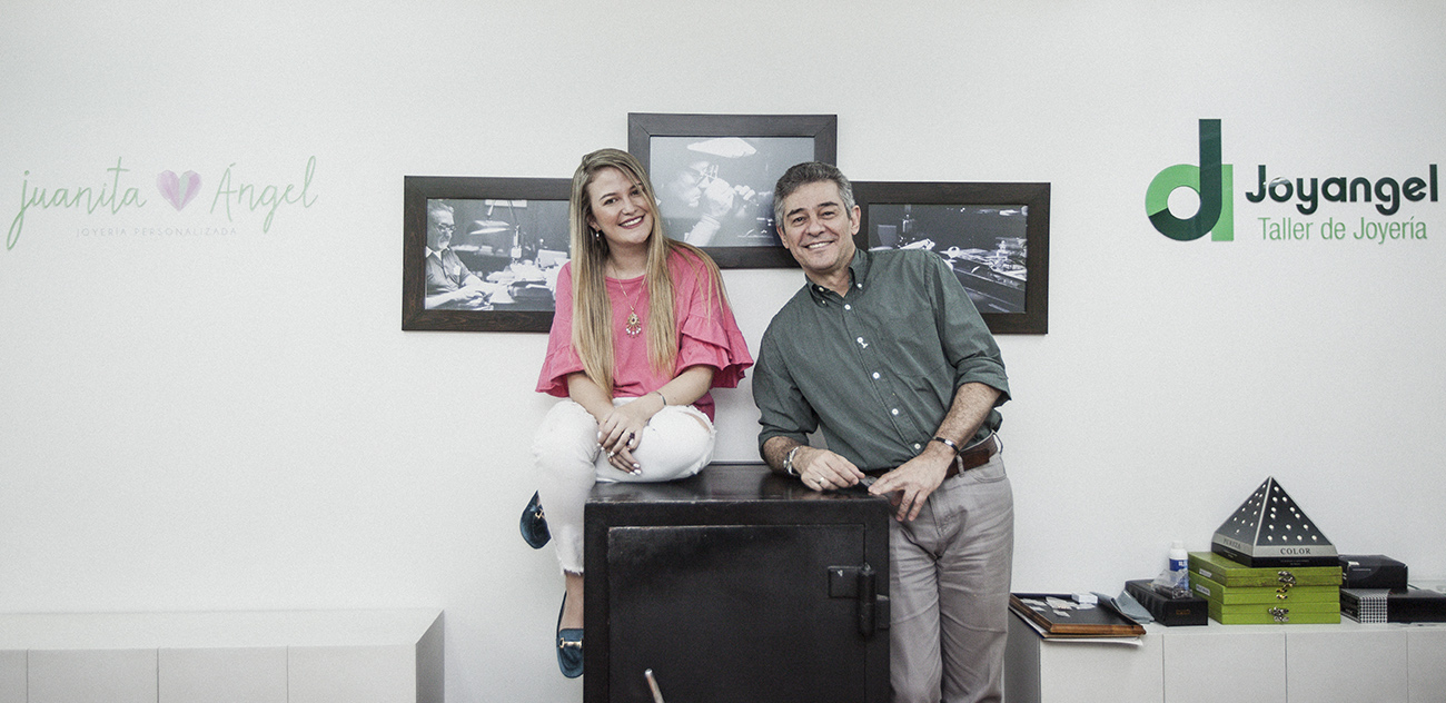 Al lado de él casi siempre está Juanita, su hija, a la que genuinamente le fue transmitiendo también el legado joyero. Cuando era apenas una niña, le pedía ayuda para diseñar aretas, collares, pulseras —y todas se vendían— para que poco a poco la joyería la fuera conquistando. Lo logró. Logró que su hija se envolviera tanto en el cuento que fundó Joyas Juanita Ángel, su propia línea de joyería personalizada enfocada en un publico más juvenil. Ella se encarga de hacer regalos para las novias de parte de sus amigas, para la madrina, para el novio, siempre con la esencia de contar historias a través de las joyas.