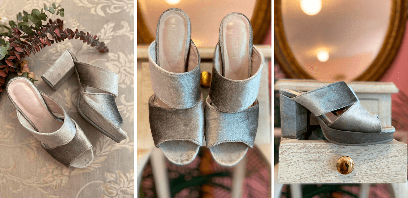 Nuestros zapatos son hechos en cuero, sin embargo, encontramos que para las novias funciona mucho más el velvet, por su suavidad y apariencia metalizada, que le da un toque romántico y femenino.