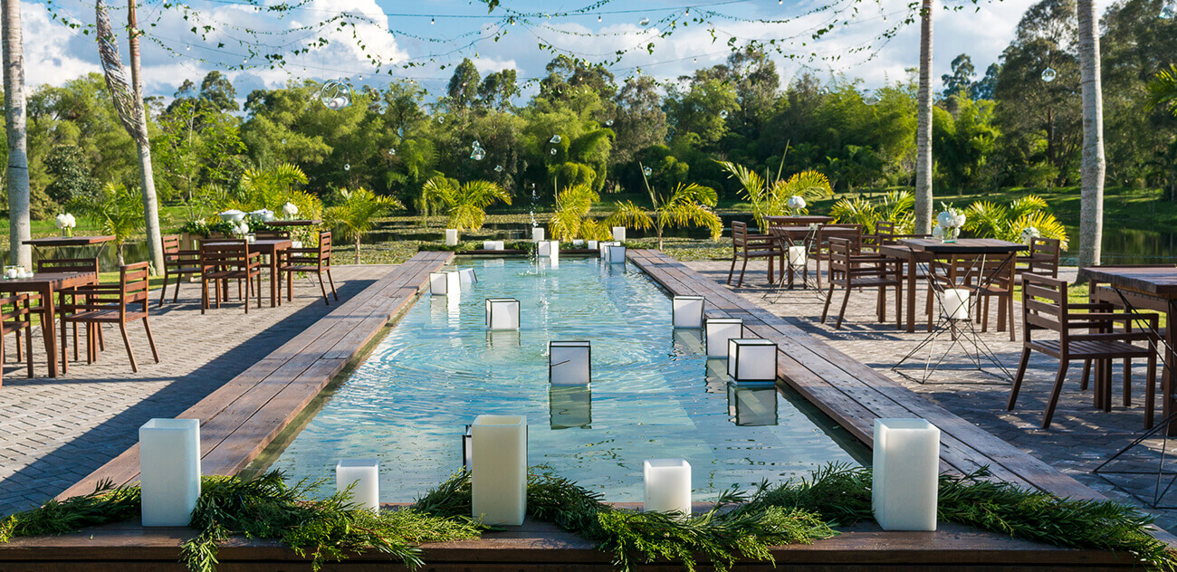 De un viaje por el sudeste asiático nació el concepto para la segunda locación: Casa Bali. Con un sofisticado y exótico encanto oriental, que evoca elegancia y tranquilidad, la casa puede recibir cerca de 400 invitados. La rodean palmeras y jardines; un lago y una playa de arena blanca, ideal para las ceremonias; y una terraza con un relajante espejo de agua.