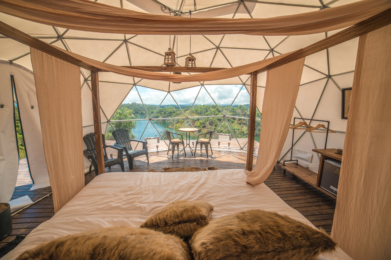 Cada uno de estos refugios, de 30 metros cuadrados, cuenta con todas las comodidades: una cama king size, lencería de alta calidad, minibar, sistema de ventilación natural, un baño con regadera al aire libre, agua caliente y amenities de lujo. Lujo es la vista que desde ellos se tiene del embalse, lujo es poder desayunar en su terraza, contemplar amaneceres y atardeceres, disfrutar de una noche estrellada, de los sonidos de la naturaleza, respirar aire puro. Lujo es ser parte del bosque.