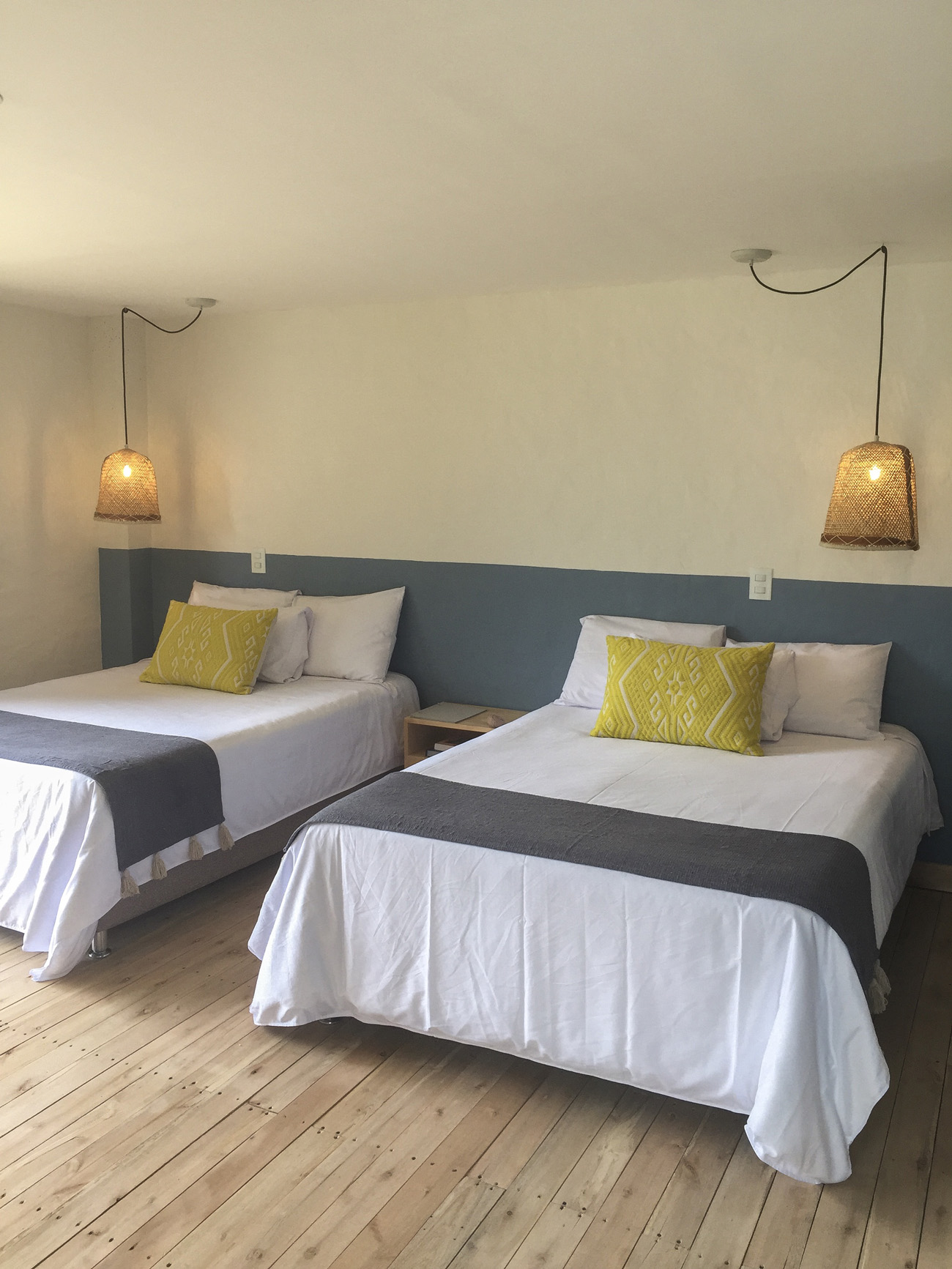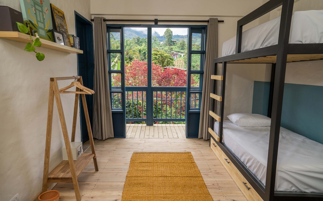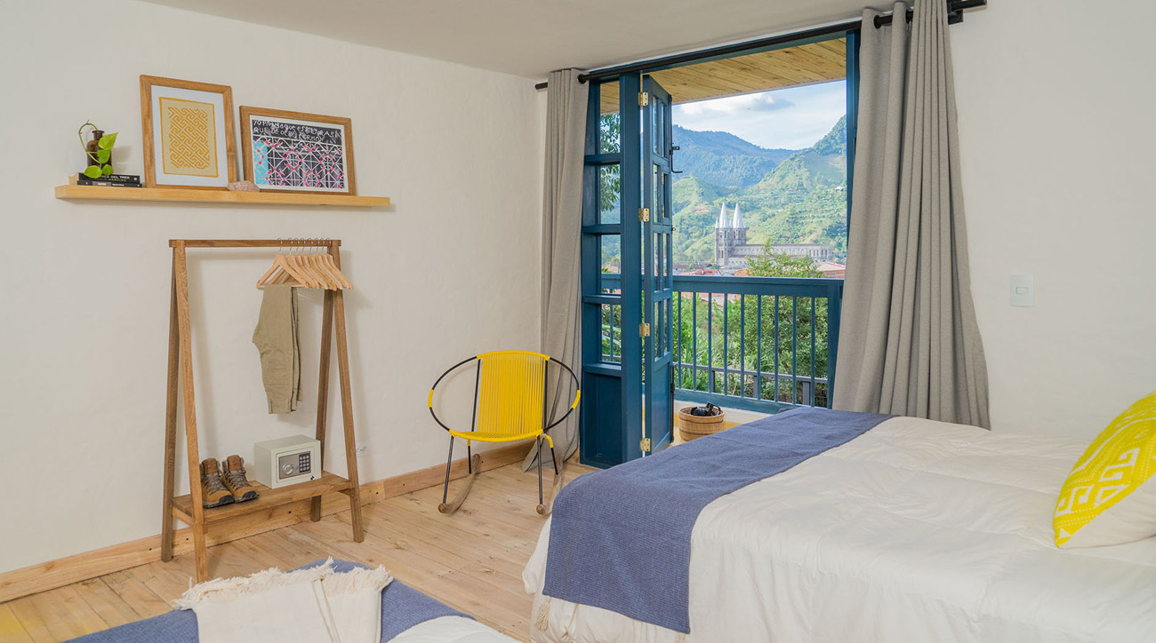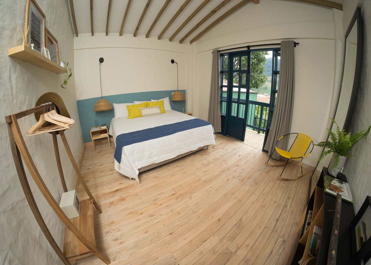 El hotel cuenta con solo seis habitaciones, con una capacidad para recibir a 16 personas. Espacios íntimos con todas las comodidades, que al entrar huelen a eucalipto por su piso de madera que proviene de bosques reforestados. Pisos sin pulir, con los clavos a la vista, al natural, con ese toque cálido y bonito que transmite también la paleta de colores, los muebles, los objetos de diseño colombiano, las piezas fabricadas por artesanos del país y el talento de artistas locales. No hay televisores porque el mejor plan es mirar por los balcones y ventanas o abrir alguno de los libros dejados por ahí, para los que aman la lectura.