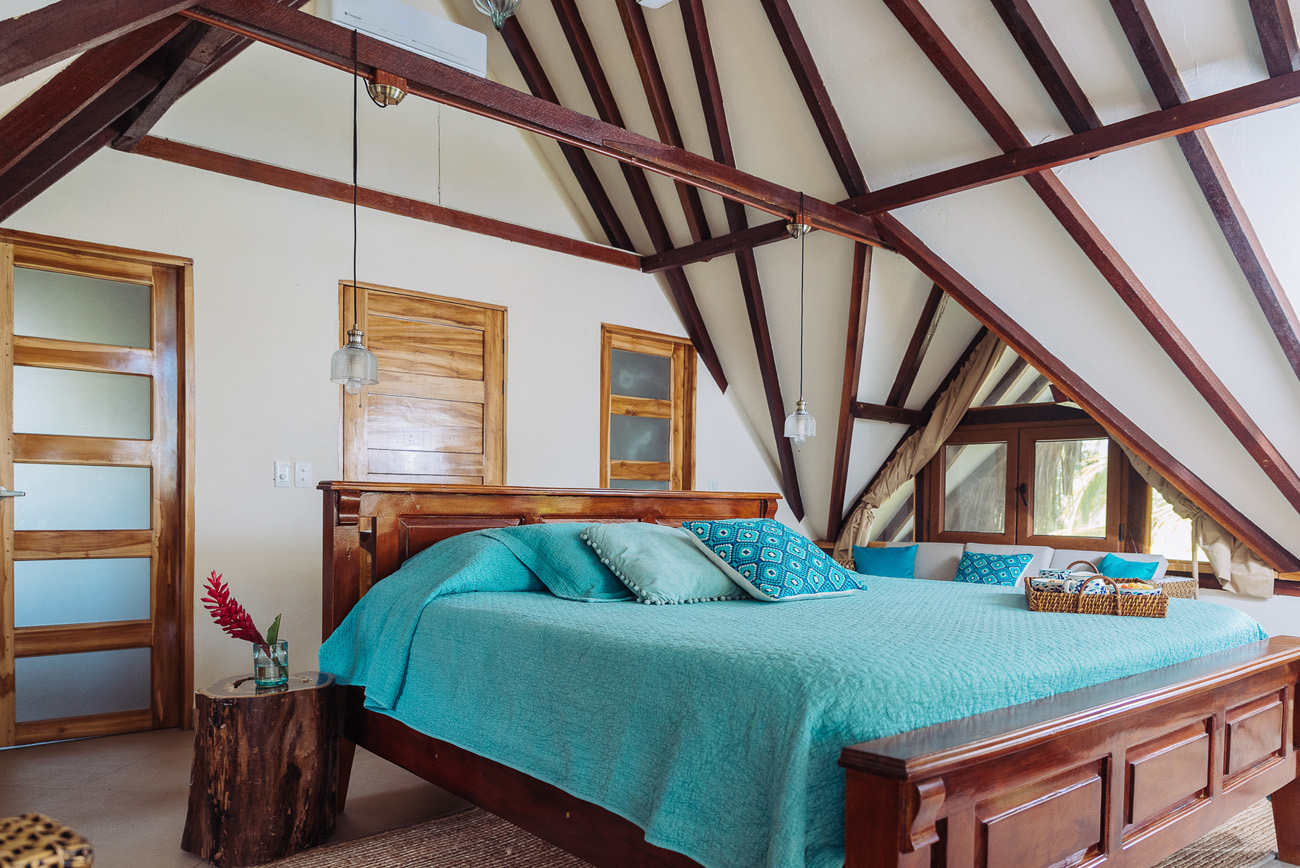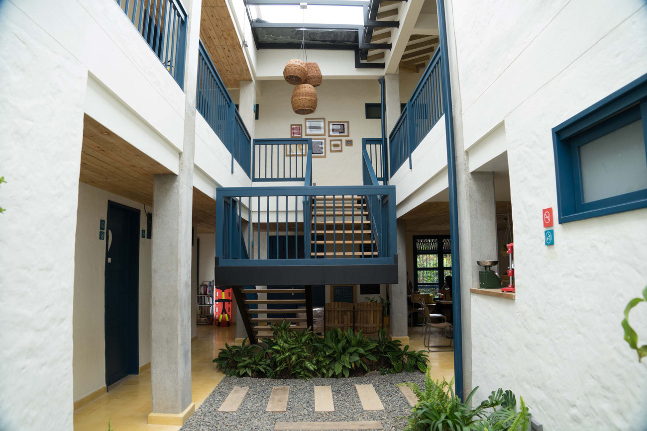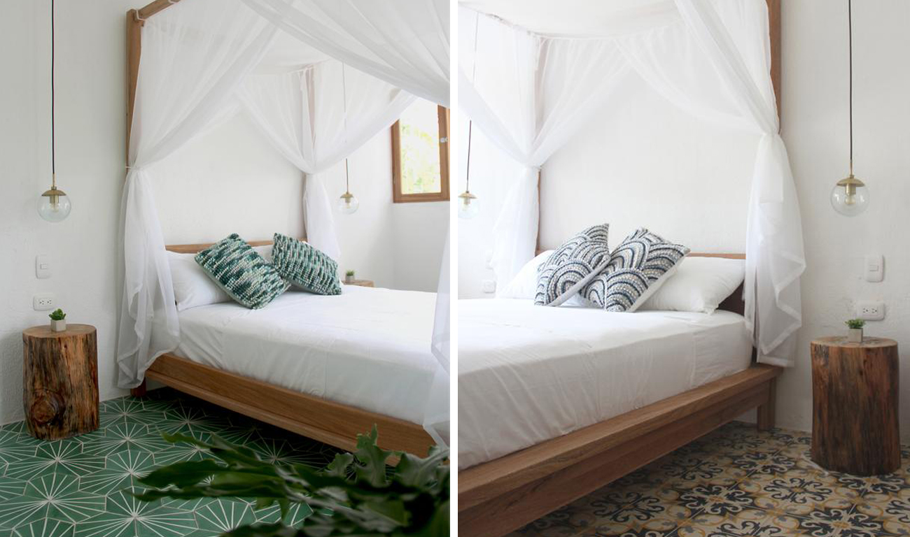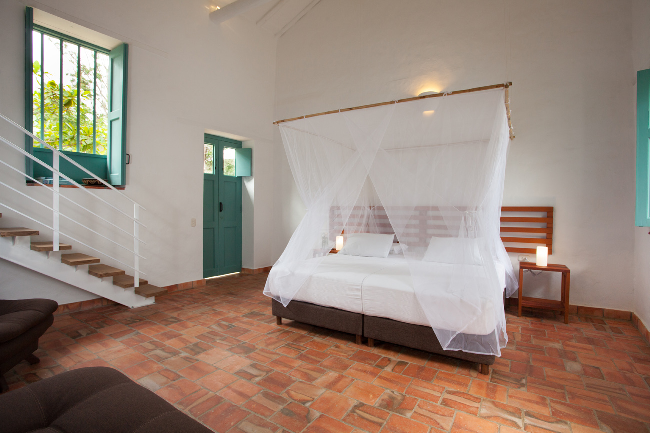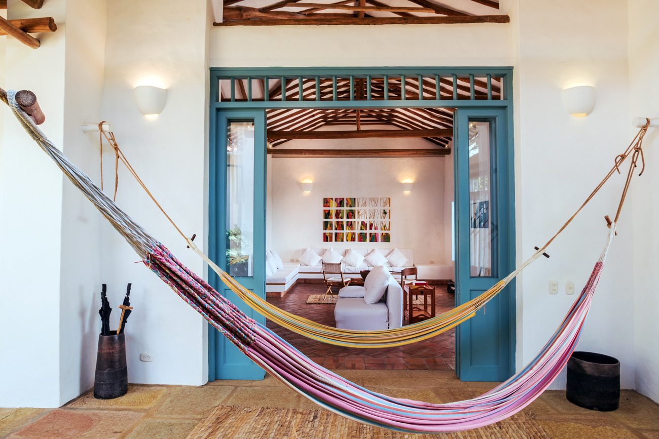 El hotel cuenta con solo seis habitaciones, con una capacidad para recibir a 16 personas. Espacios íntimos con todas las comodidades, que al entrar huelen a eucalipto por su piso de madera que proviene de bosques reforestados. Pisos sin pulir, con los clavos a la vista, al natural, con ese toque cálido y bonito que transmite también la paleta de colores, los muebles, los objetos de diseño colombiano, las piezas fabricadas por artesanos del país y el talento de artistas locales. No hay televisores porque el mejor plan es mirar por los balcones y ventanas o abrir alguno de los libros dejados por ahí, para los que aman la lectura.