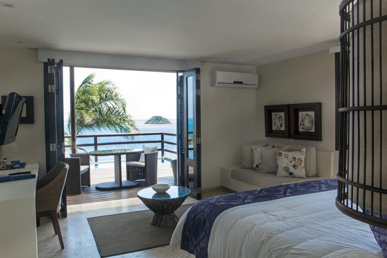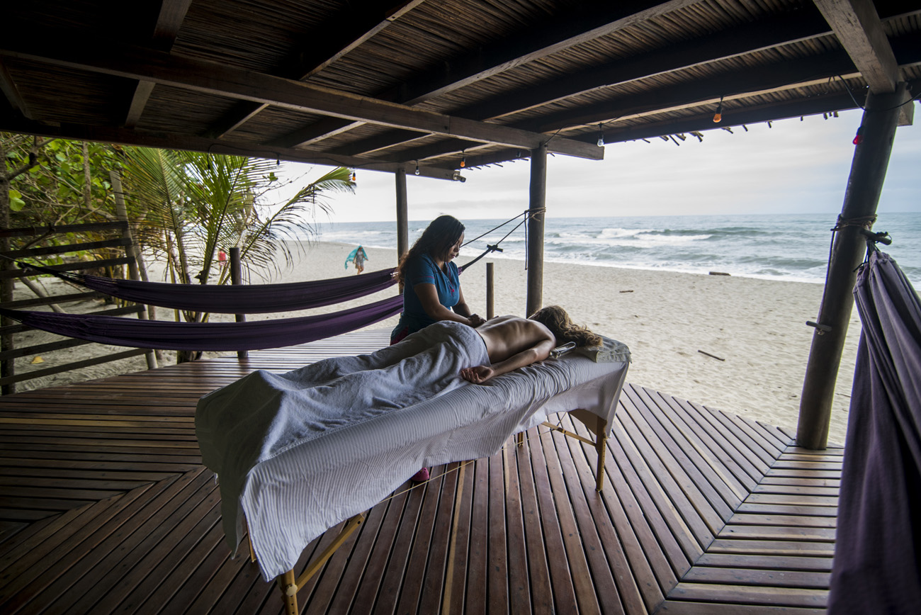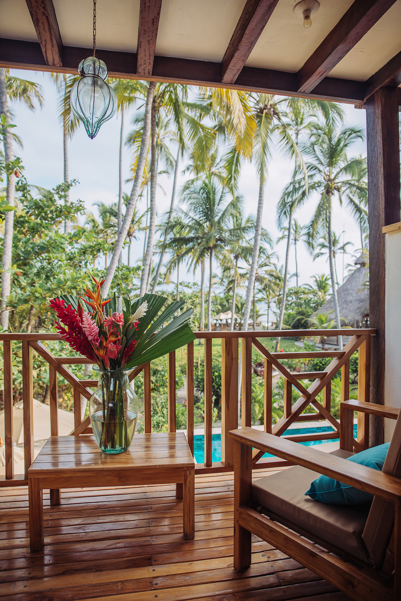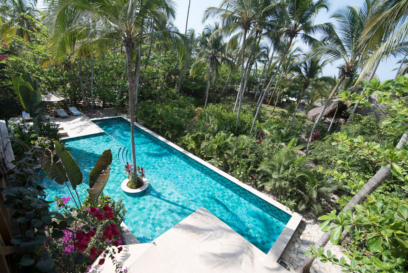 Lujo tropical podría ser una buena forma de definir el estilo y la decoración de este hotel conformado por doce habitaciones –Standard, Deluxe y Superior– distribuidas en tres edificios con techos de palma que se mimetizan con la exuberante vegetación. La imponente piscina, rodeada de jardines, está a un paso de la playa donde hay hamacas a la sombra y sillas con cojines para disfrutar del paisaje con el máximo confort. El restaurante al aire libre junto a la piscina y un kiosko con un estudio de yoga complementan los atractivos de este edén colombiano que se descubre entre el mar y la selva.
